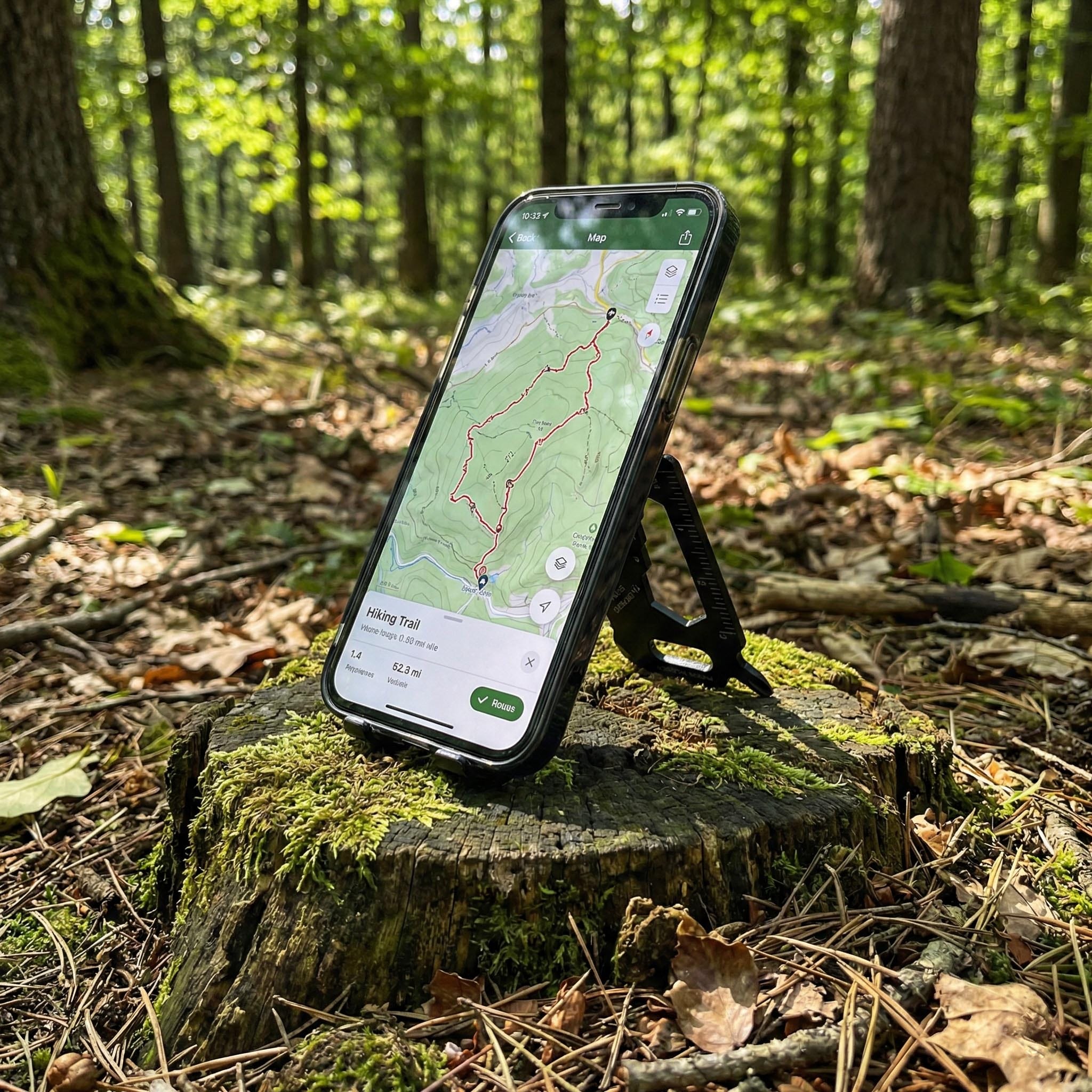 O: Konstrukcja „Phone Holder” opiera się na stabilnym podparciu urządzenia pod odpowiednim kątem. Brelok radzi sobie świetnie z większością nowoczesnych smartfonów w standardowych etui, zapewniając stabilność na płaskim podłożu (np. pniu drzewa czy stole).