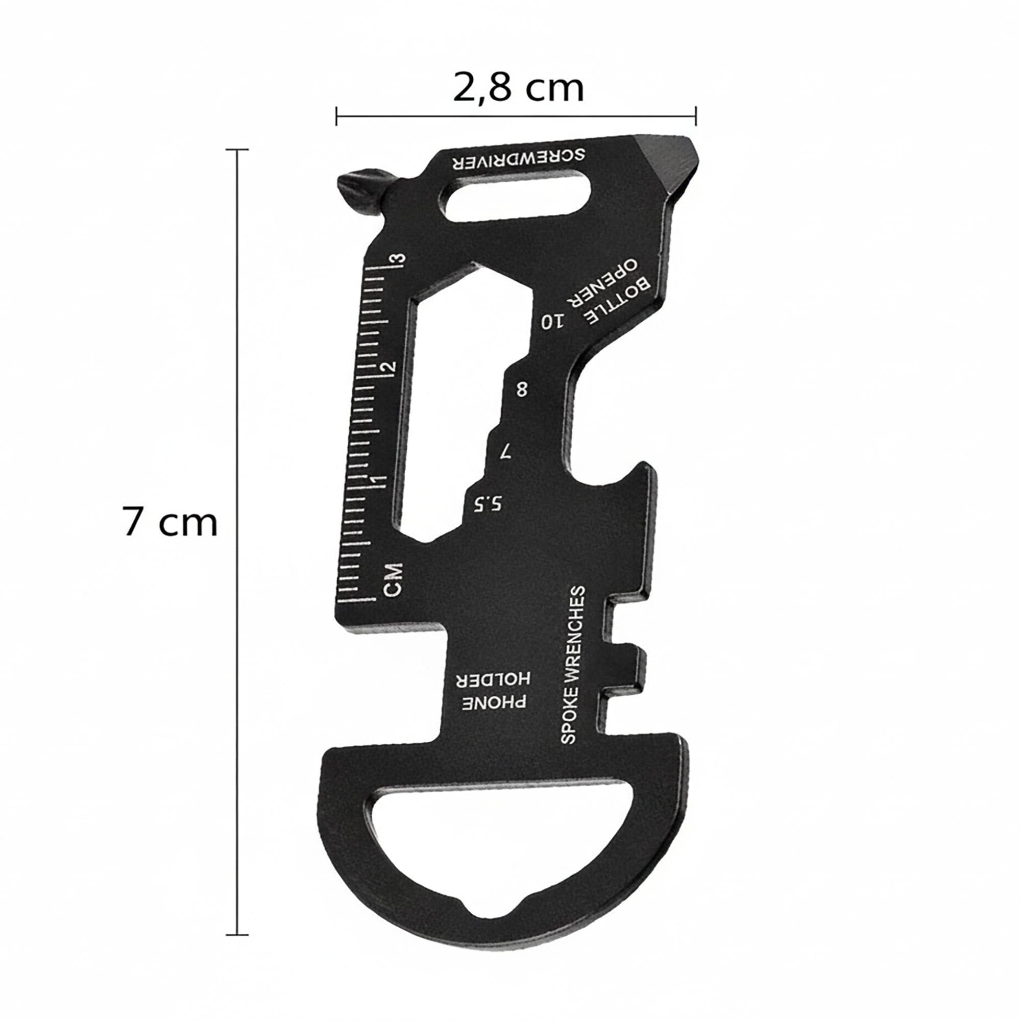 | Funkcje | Śrubokręt płaski i krzyżakowy, Klucze sześciokątne (5,5 mm, 7 mm, 8 mm, 10 mm), Otwieracz do butelek, Uchwyt na smartfona, Klucze do szprych, Skala pomiarowa, Oczko do kluczy lub przewleczenia linki |
