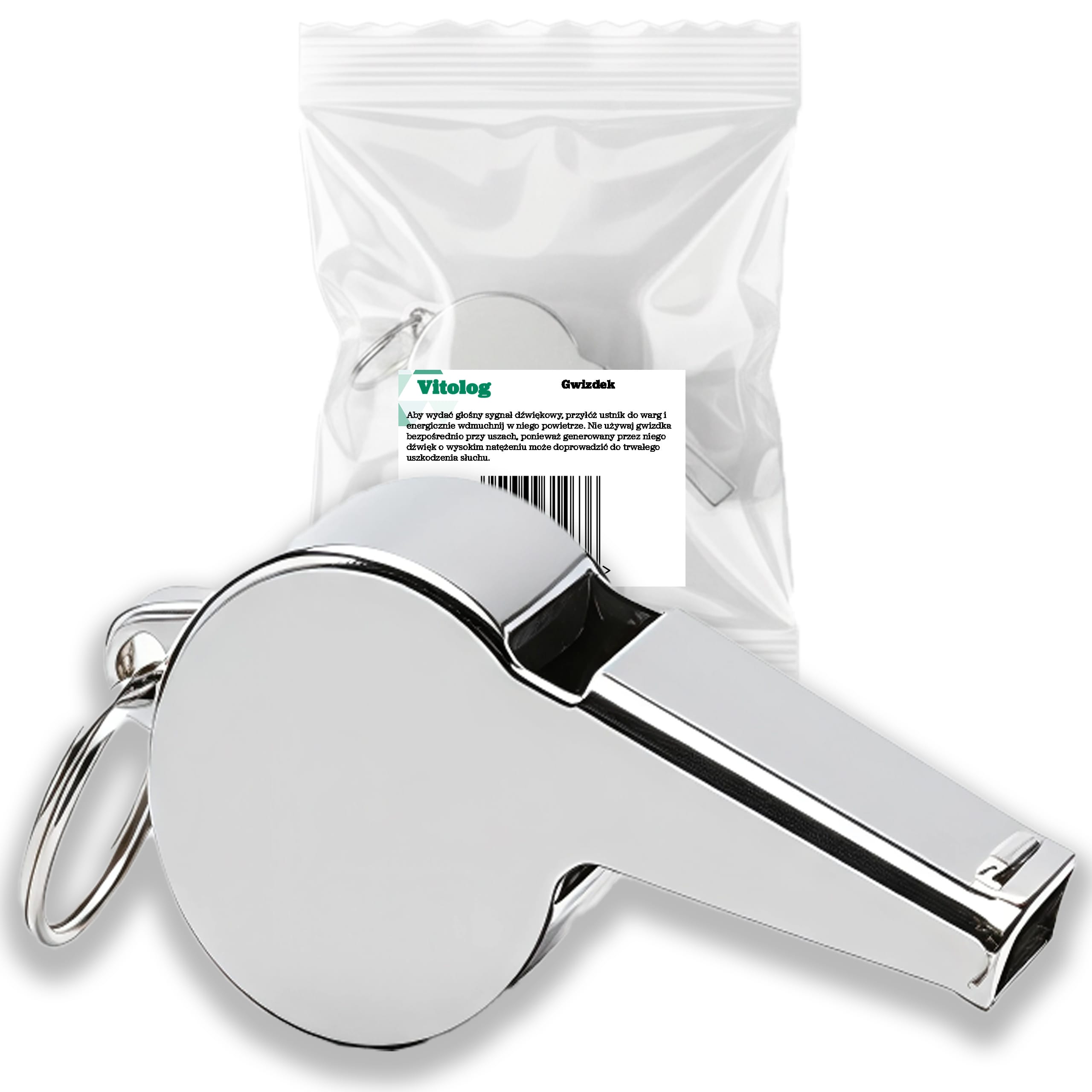 - Opakowanie: Gwizdek dostarczany jest w ochronnej folii (widocznej na zdjęciu), co gwarantuje czystość produktu przed pierwszym użyciem.