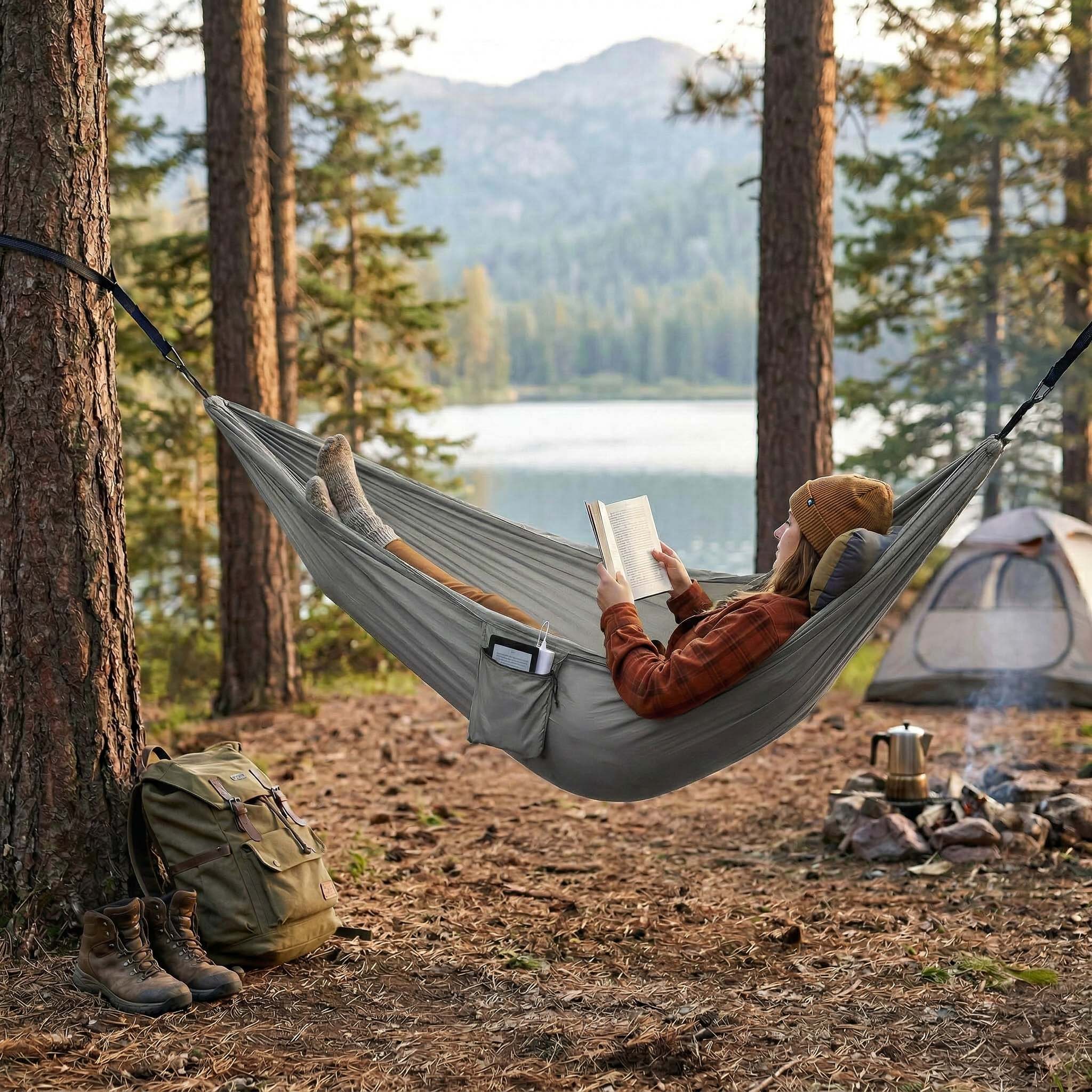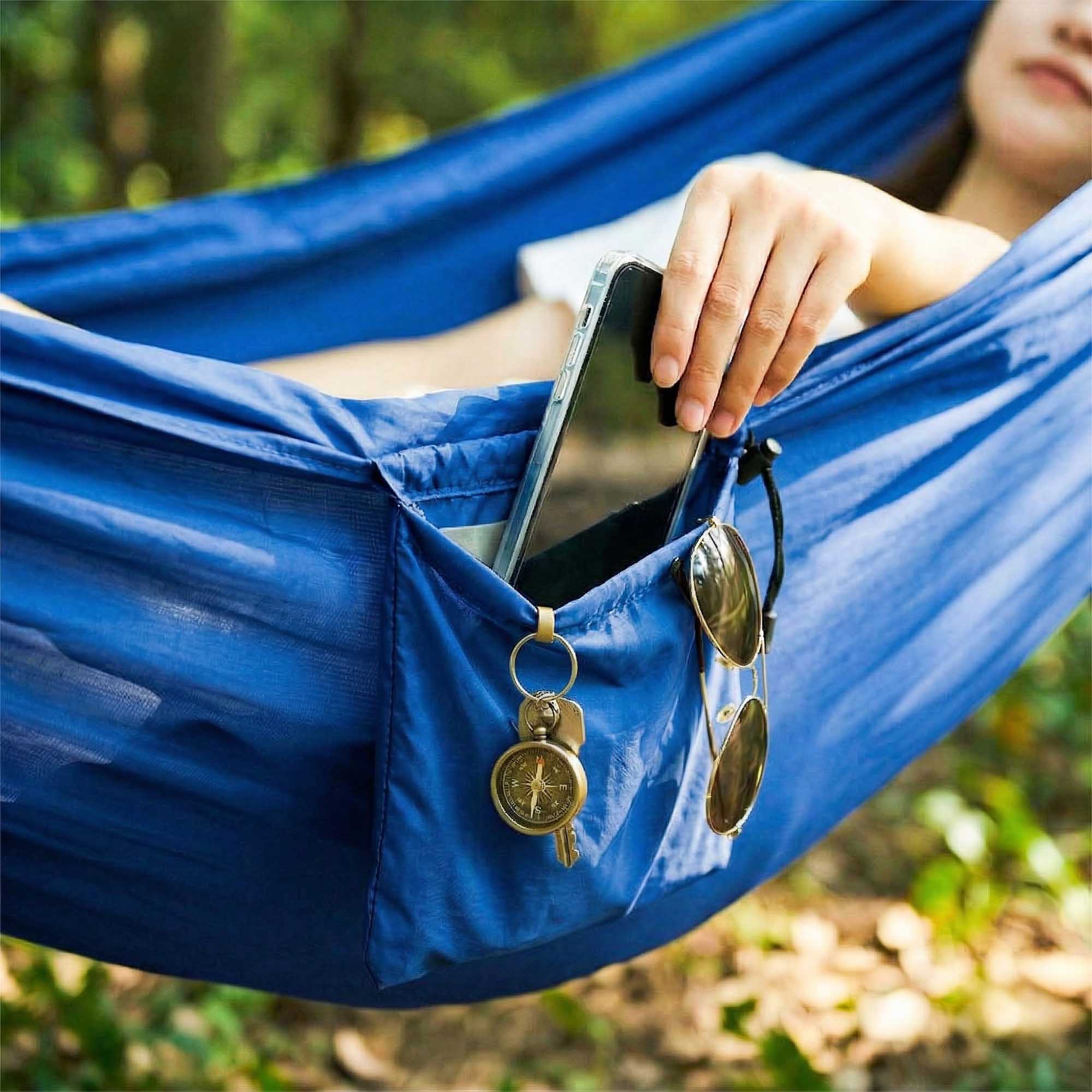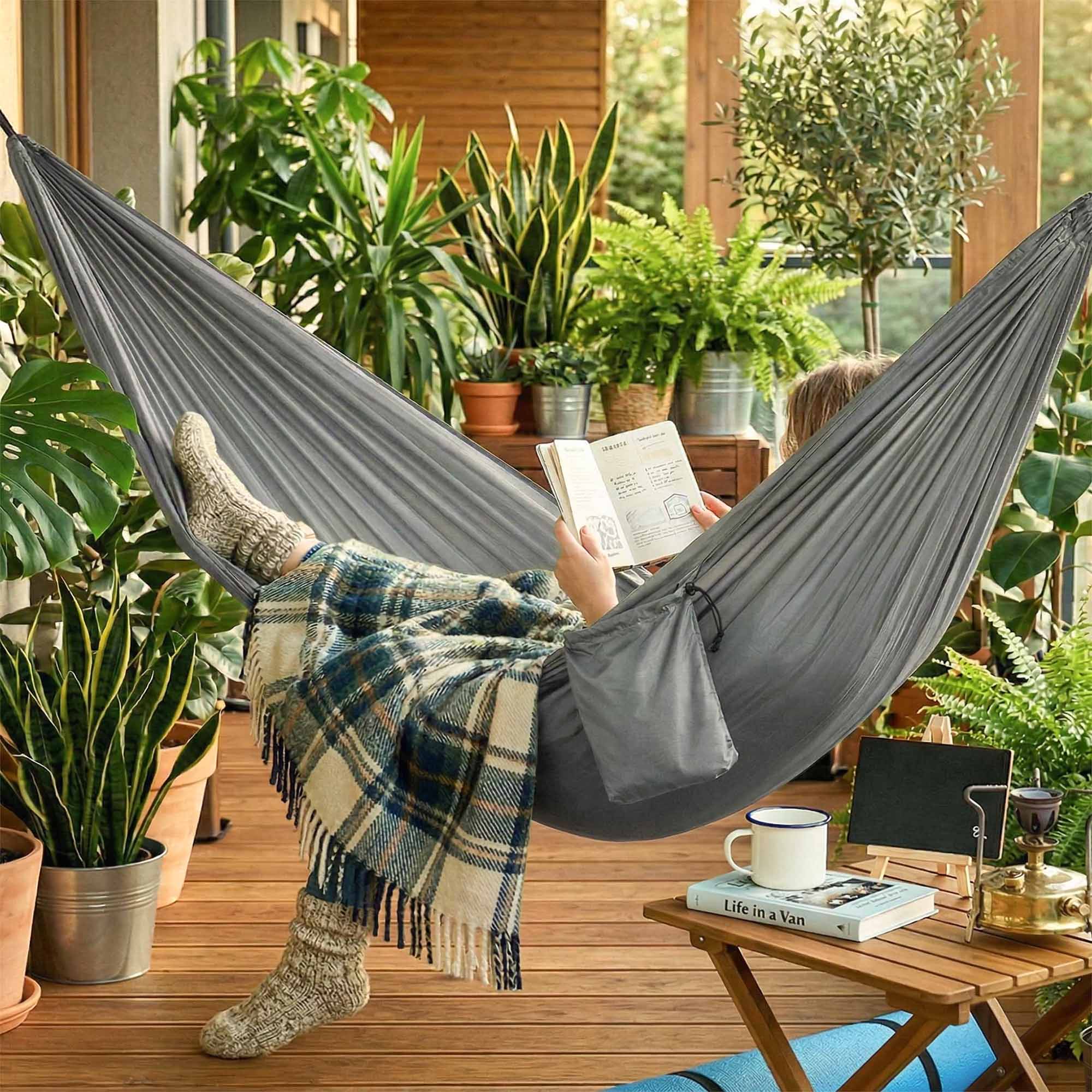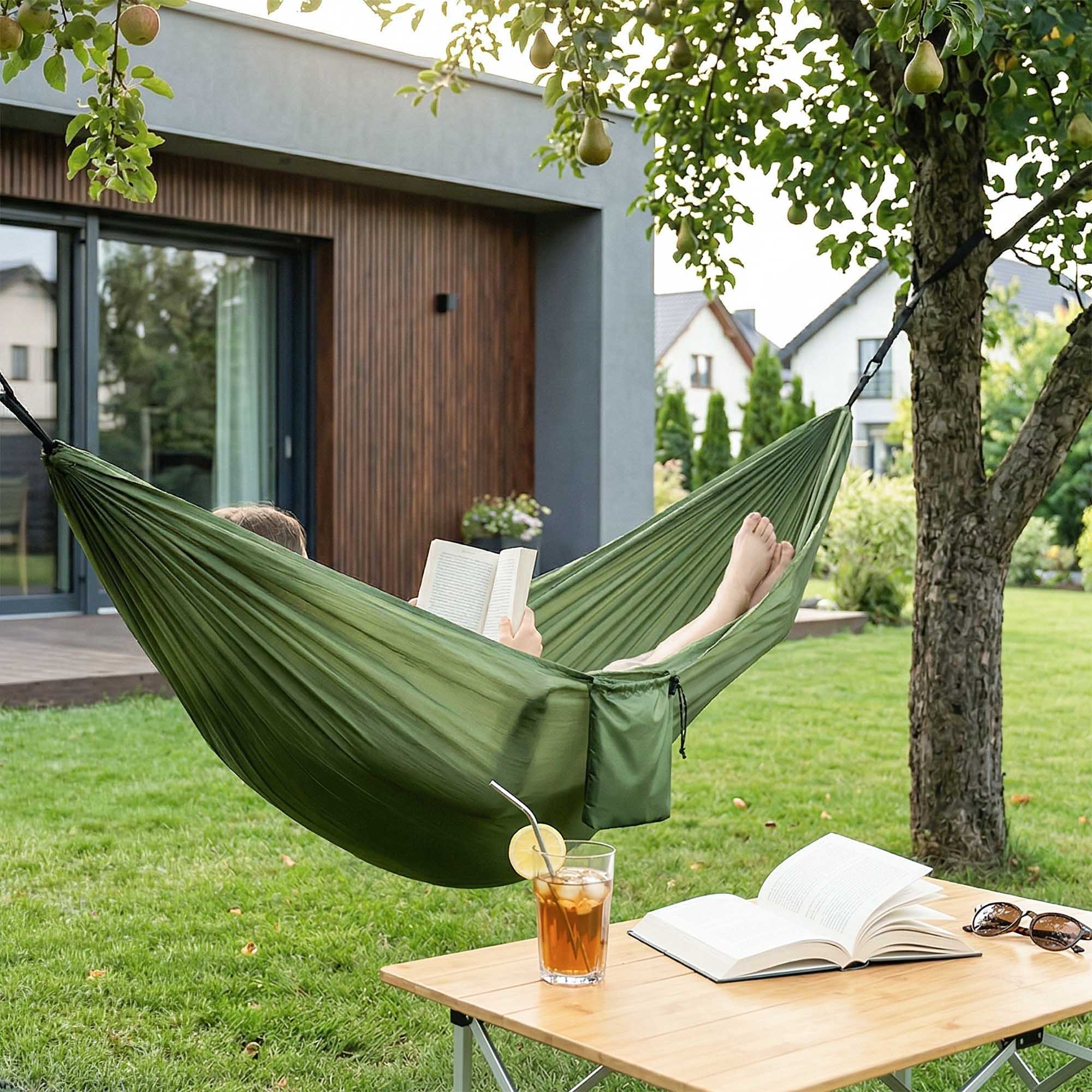 - Zintegrowany pokrowiec typu „Side-Pocket”: Innowacyjne rozwiązanie polegające na przyszyciu worka transportowego bezpośrednio do boku hamaka. Dzięki temu pokrowiec nigdy się nie zgubi, a podczas relaksu służy jako praktyczna kieszonka na telefon, książkę lub napój.