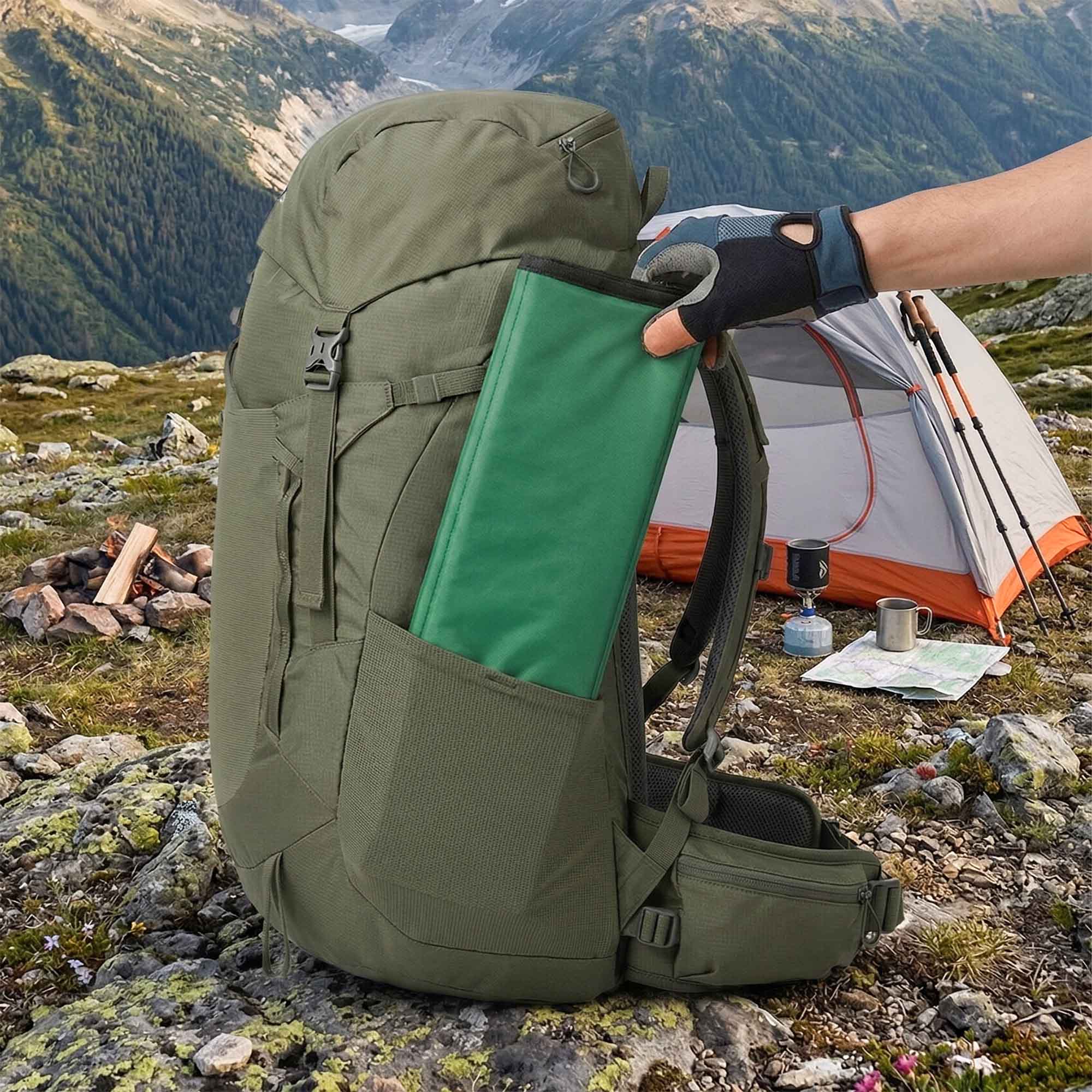 - Kompaktowa, Harmonijkowa Konstrukcja: Mata składa się w cztery segmenty, co pozwala na błyskawiczne złożenie jej do formy poręcznego prostopadłościanu. Po złożeniu zajmuje minimalną ilość miejsca i bez trudu mieści się w bocznej kieszeni plecaka turystycznego.