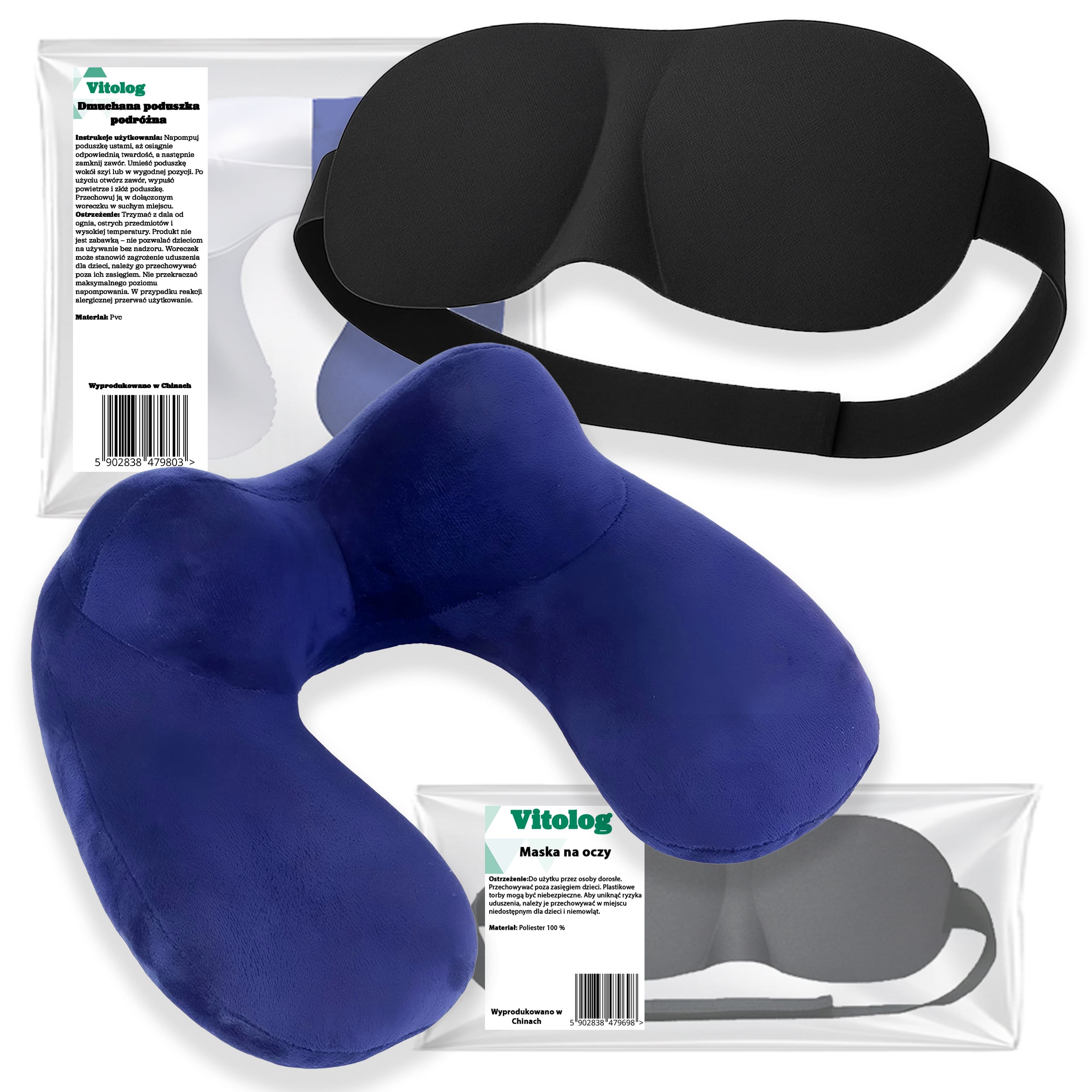 Zestaw Podróżny: Dmuchana Poduszka Rogal PVC Welur + Maska na Oczy 3D Profilowana