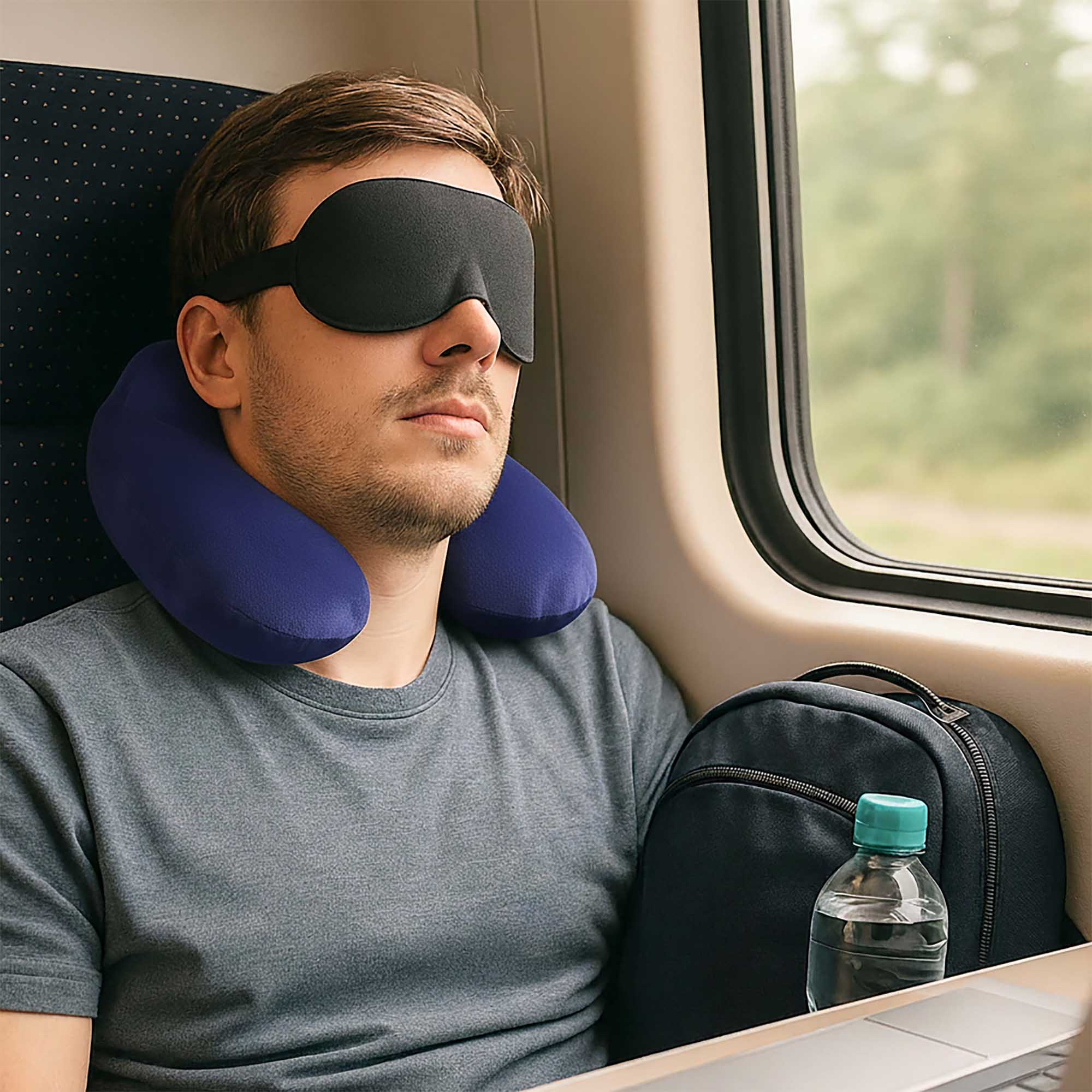 Kompleksowy zestaw podróżny składający się z ergonomicznej poduszki dmuchanej typu rogal oraz profilowanej maski na oczy w technologii 3D. Poduszka została zaprojektowana w celu stabilizacji odcinka szyjnego kręgosłupa w pozycji siedzącej. Jej konstrukcja opiera się na szczelnym rdzeniu z PVC, który pokryto warstwą miękkiego weluru, minimalizując ryzyko podrażnień skóry. Dzięki systemowi pneumatycznemu, twardość podparcia można regulować poprzez stopień napompowania, a po wypuszczeniu powietrza produkt zajmuje minimalną ilość miejsca. Drugim elementem zestawu jest opaska na oczy wykonana z oddychającego poliestru. Zastosowanie trójwymiarowego profilowania (3D) tworzy komorę powietrzną wokół oczu, co umożliwia swobodne ruchy powiek i mruganie bez kontaktu materiału z rzęsami, gwarantując jednocześnie pełne zaciemnienie.