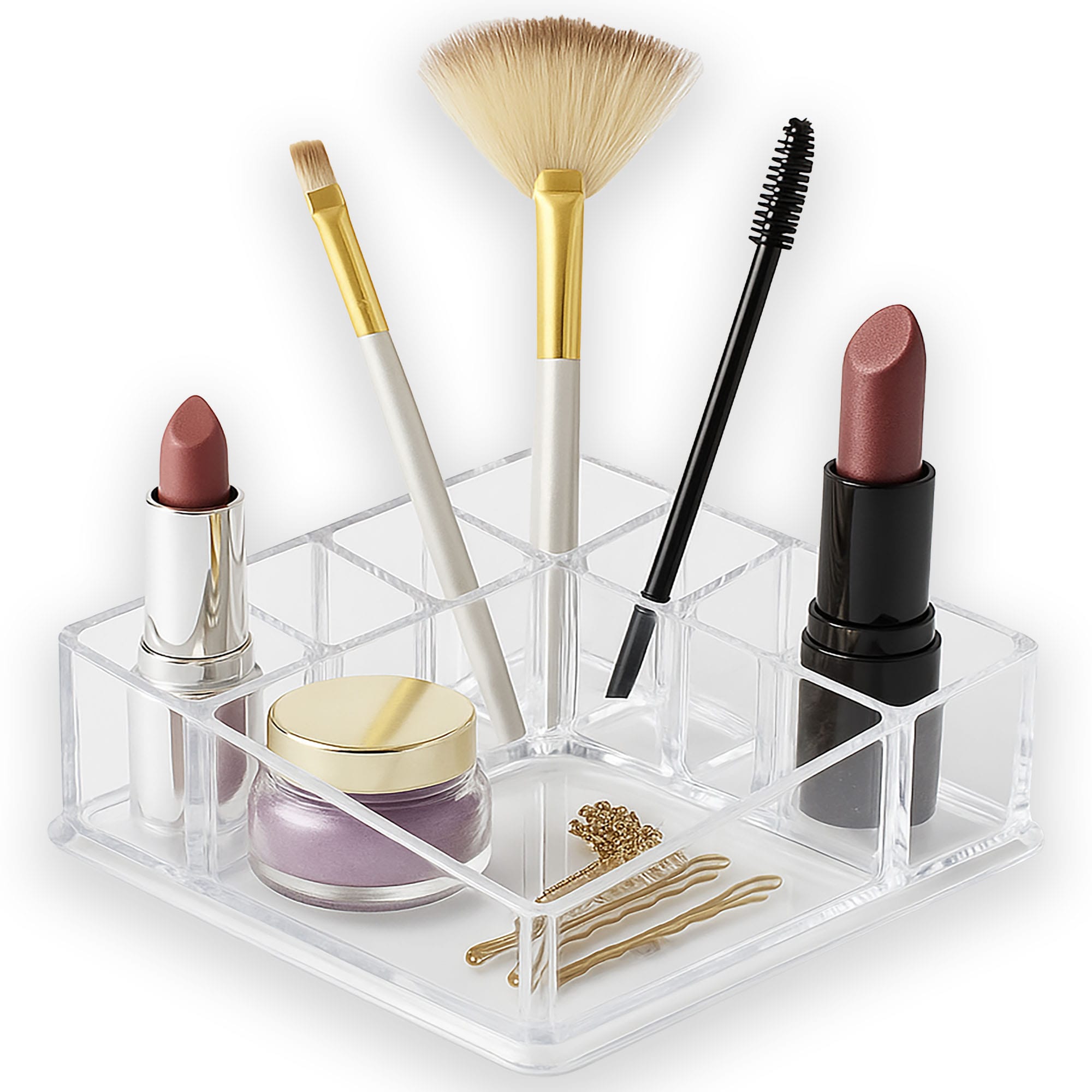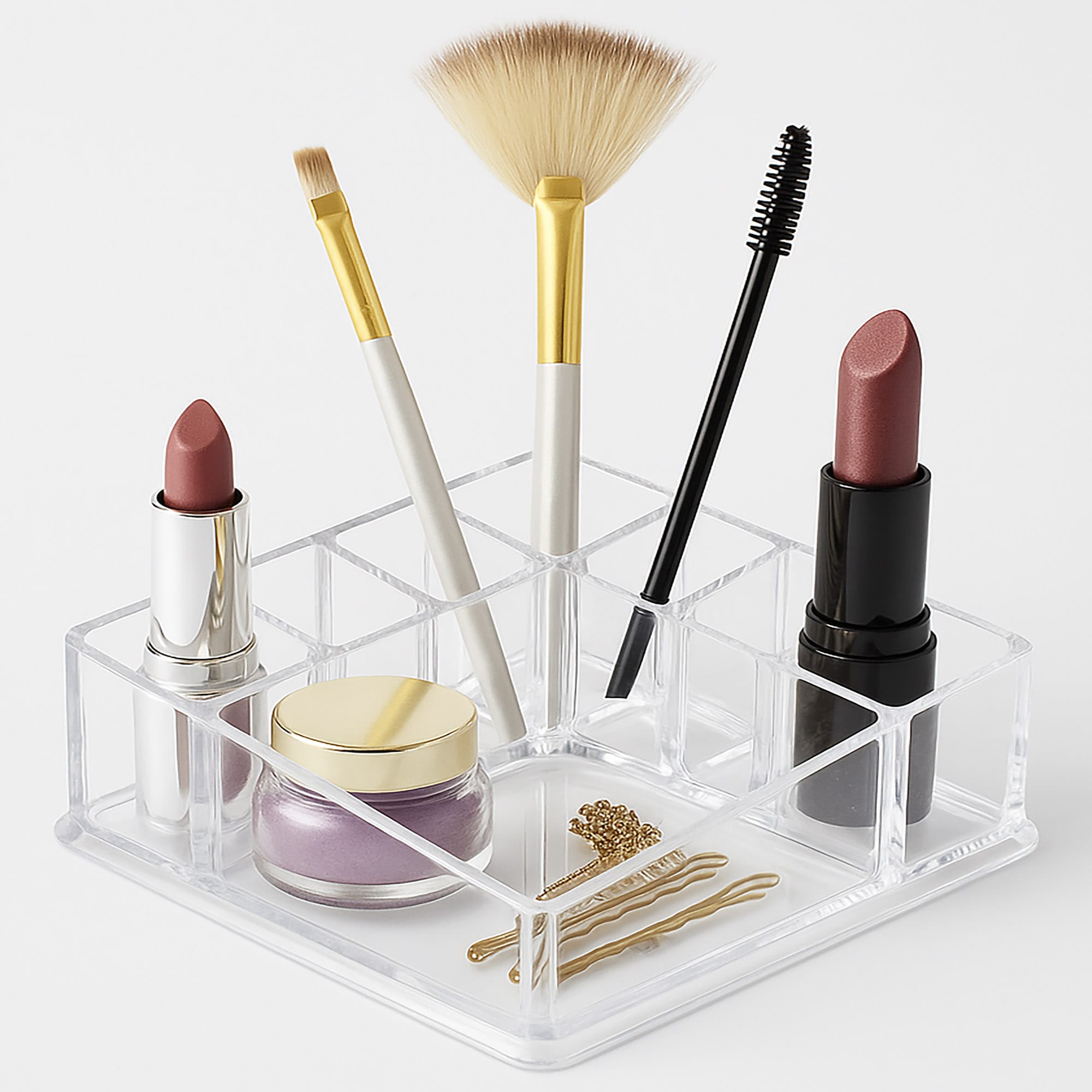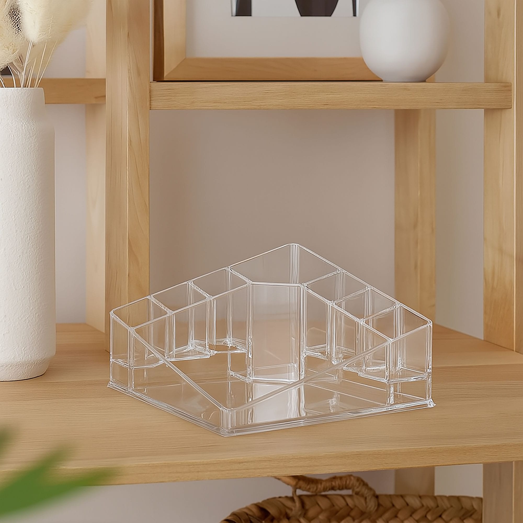 Prezentowany organizer akrylowy to funkcjonalne rozwiązanie do segregacji i przechowywania akcesoriów kosmetycznych. Jego konstrukcja z przegródkami oraz transparentny materiał przyczyniają się do utrzymania porządku i ułatwiają dostęp do niezbędnych produktów do makijażu.