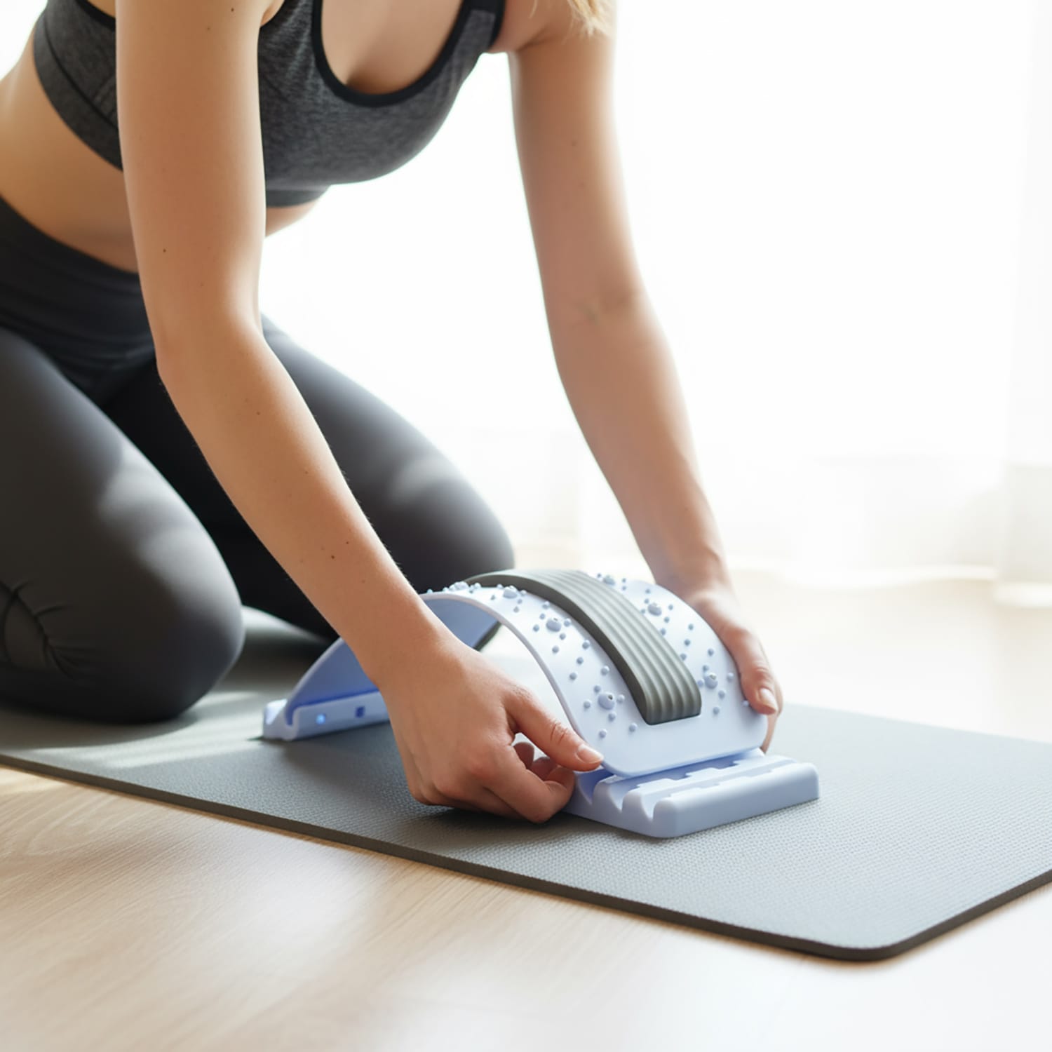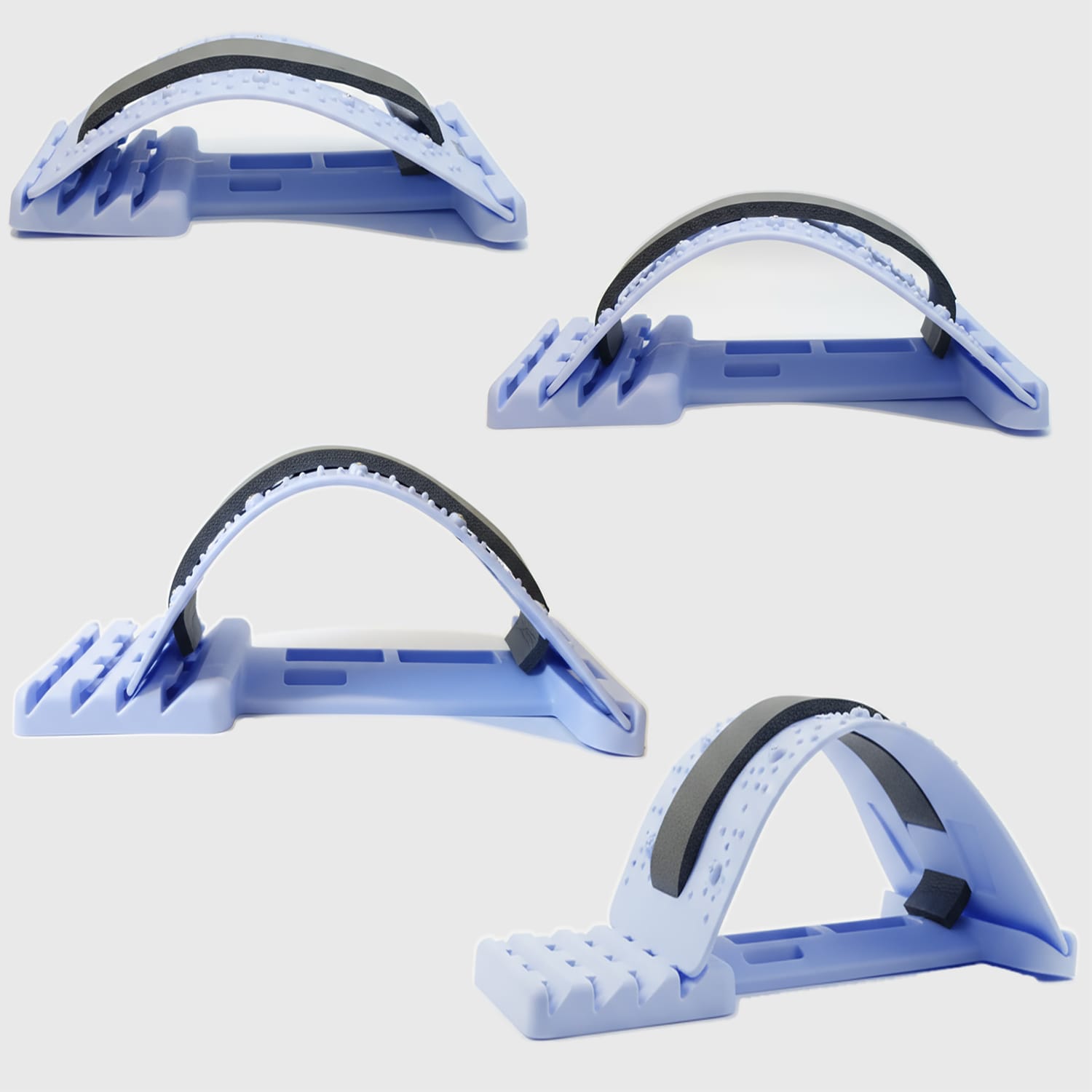 Ponadto, w centralnej części łuku zastosowano miękki, piankowy pas wykonany z materiału NBR. Pas ten stanowi barierę ochronną, minimalizując bezpośredni nacisk twardych wypustek na kręgosłup i zwiększając ogólny komfort podczas masażu i rozciągania.