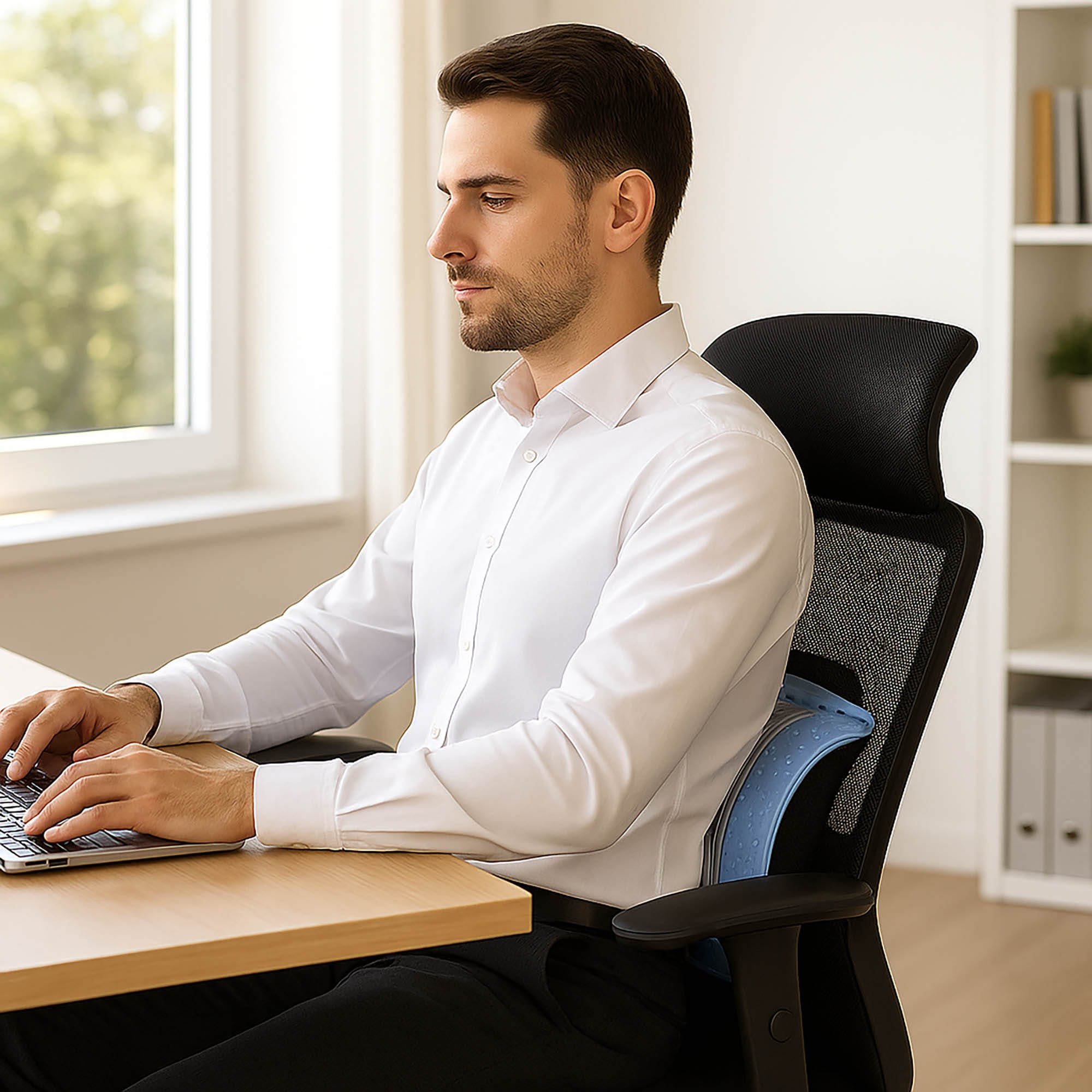 - Idealny do użytku biurowego i domowego dzięki funkcji 2w1 – przyrząd do rozciągania i podpórka pod plecy.