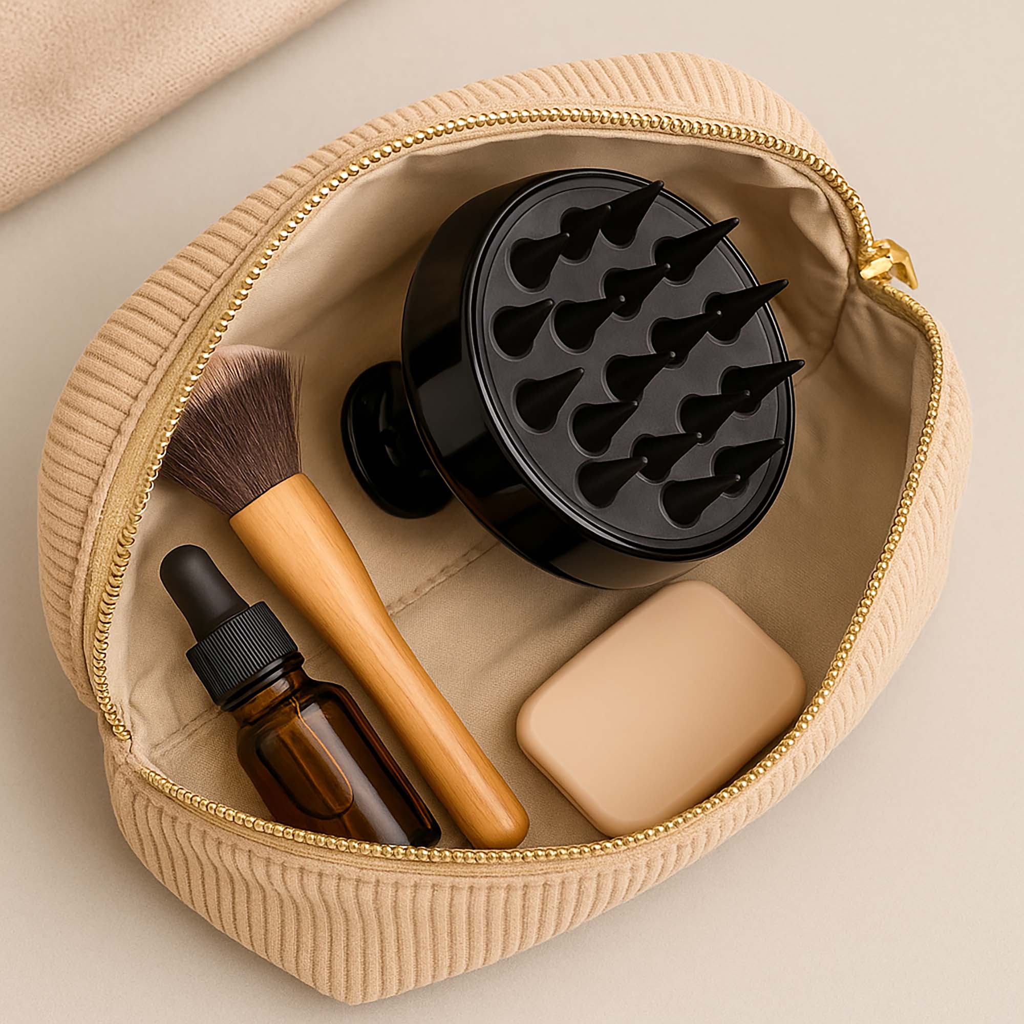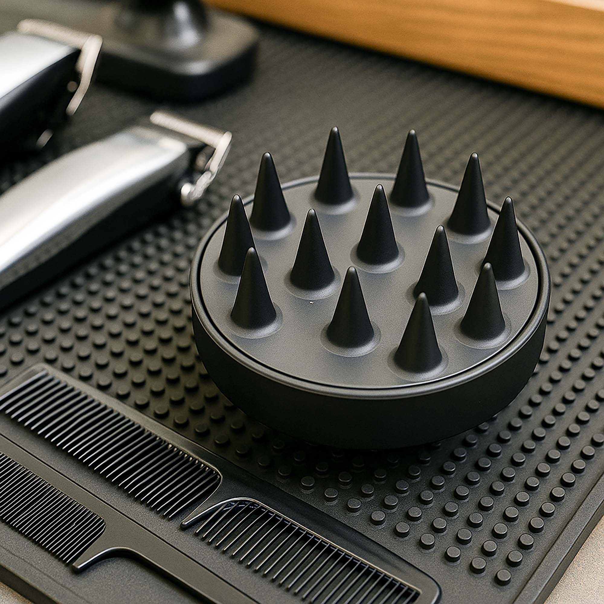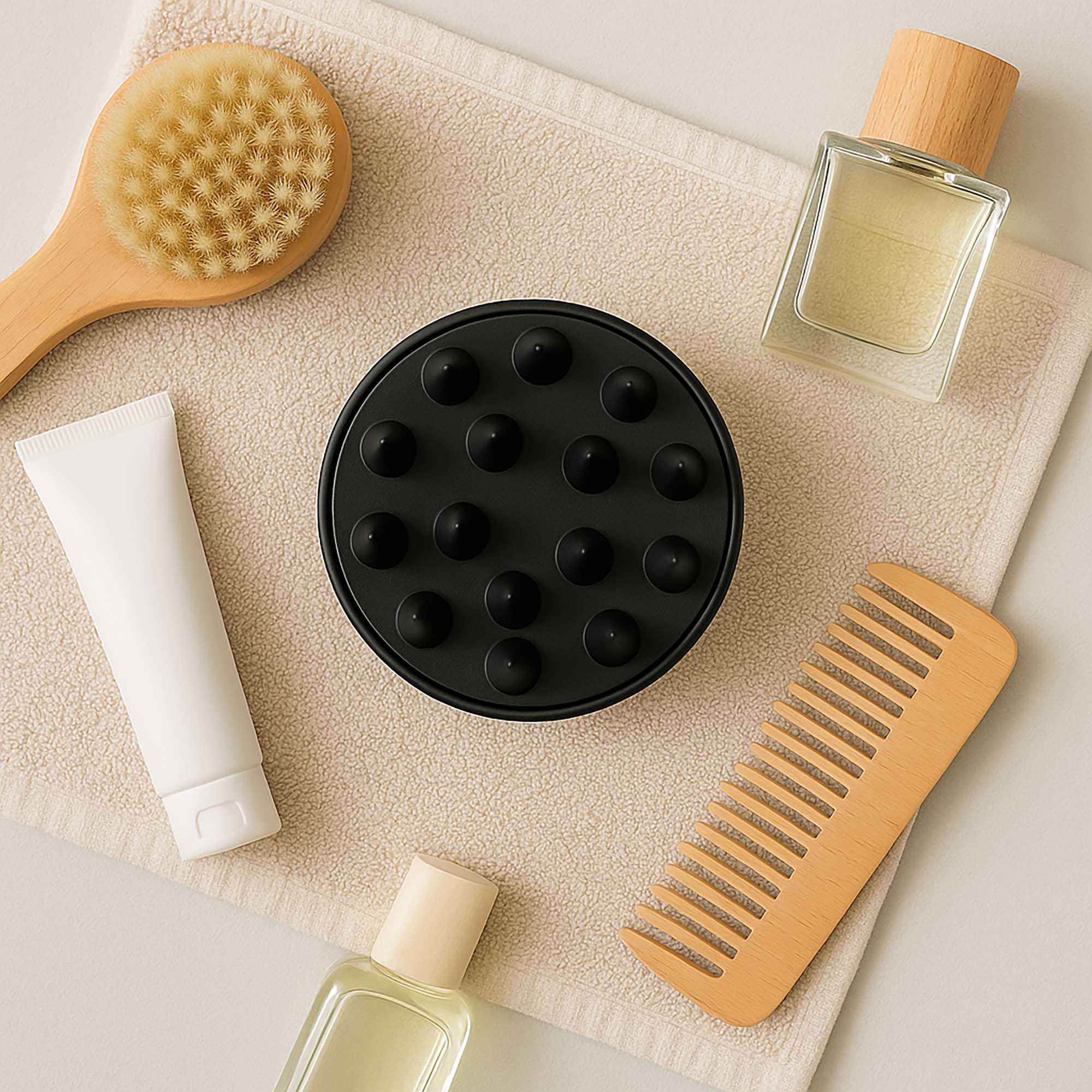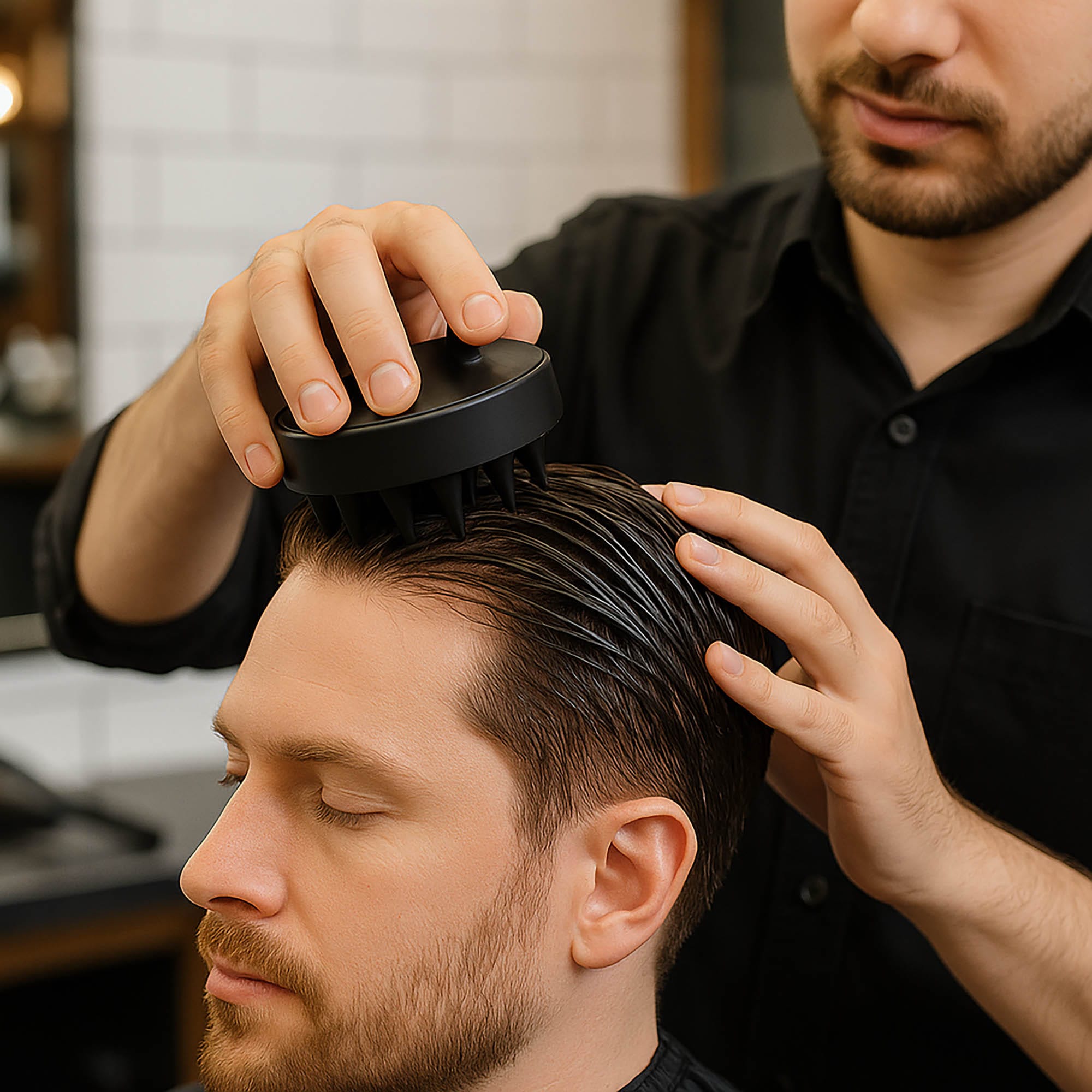 Szczotka-masażer, stosowana do mycia włosów – pomaga spienić szampon i oczyścić włosy oraz skórę głowy, ale przede wszystkim pobudza mikrokrążenie, dzięki czemu cebulki włosów są lepiej odżywione i wzmocnione.
