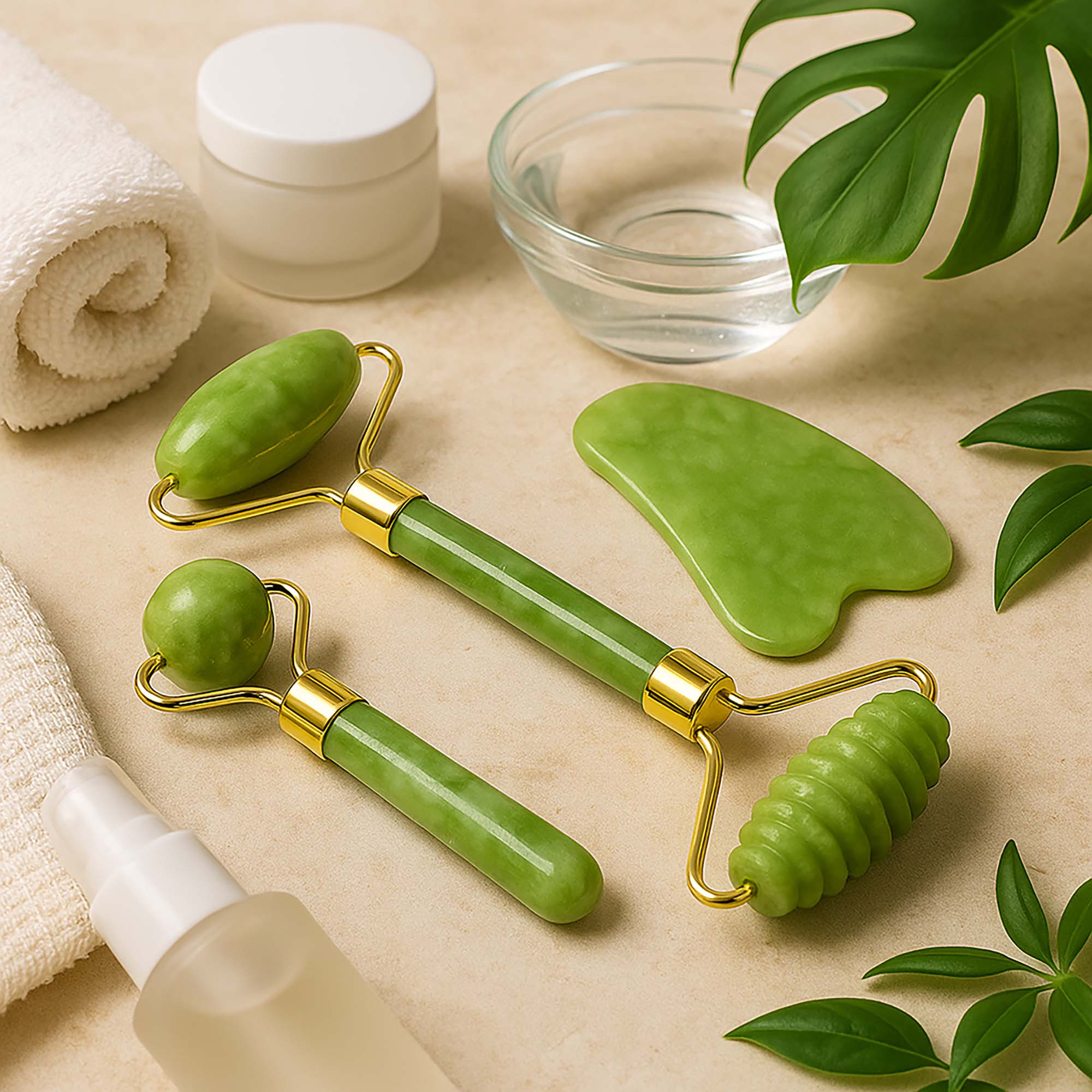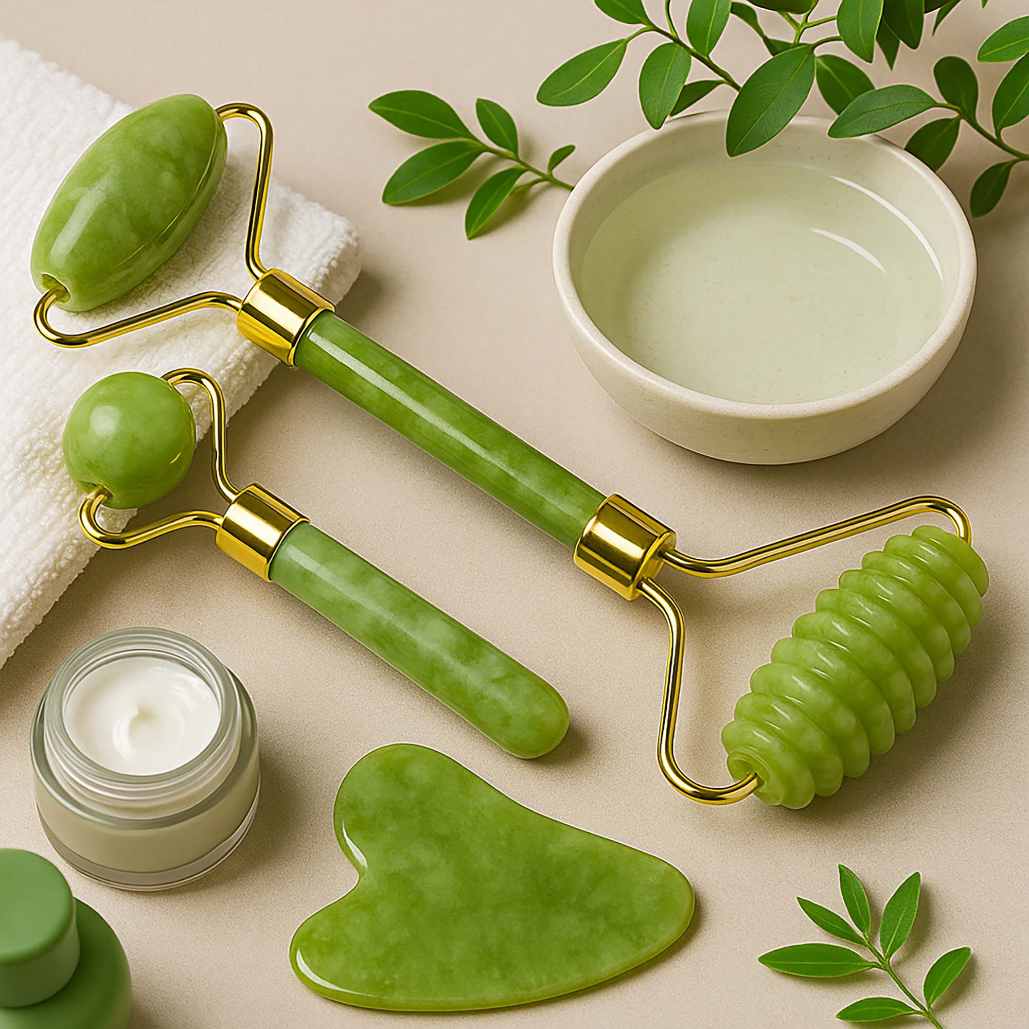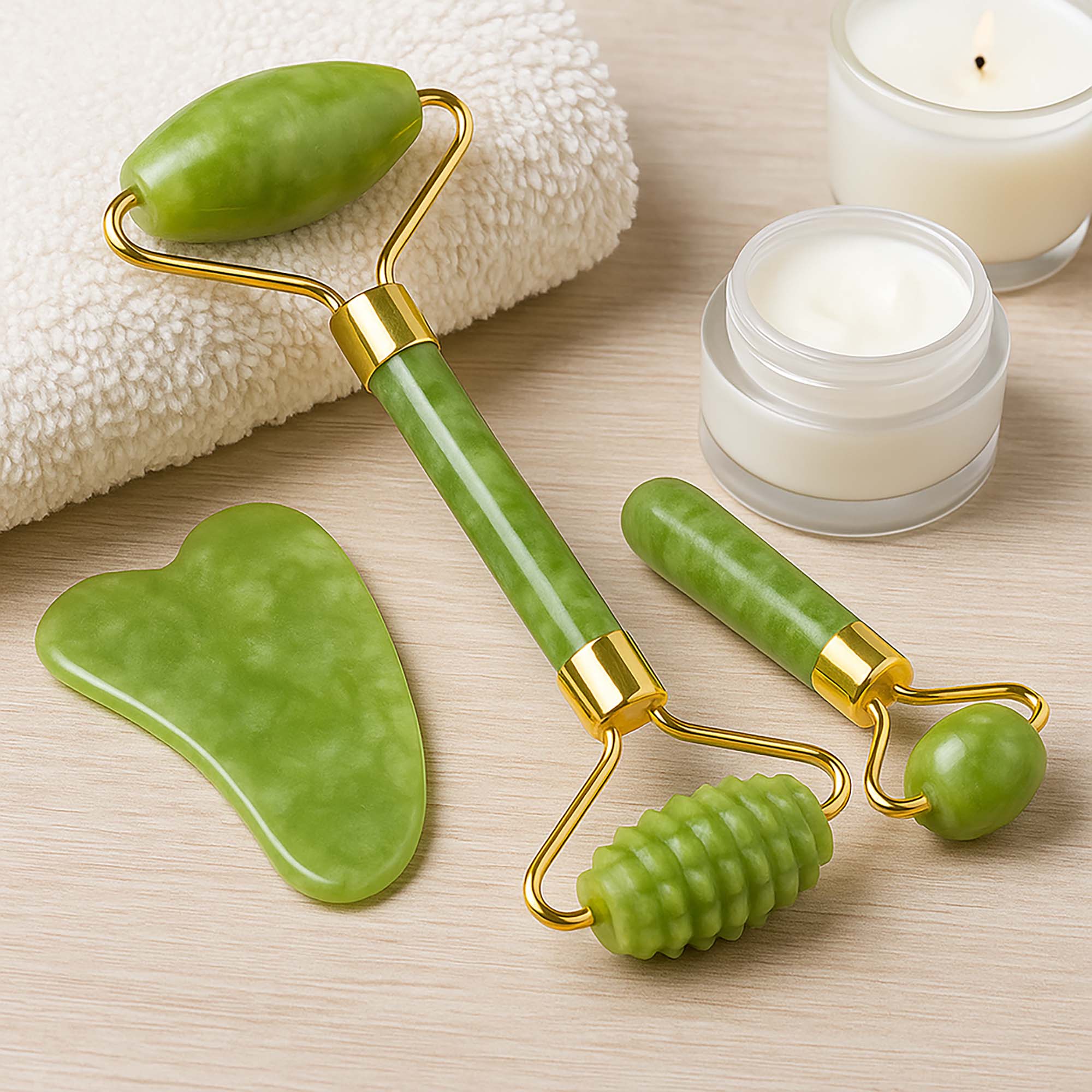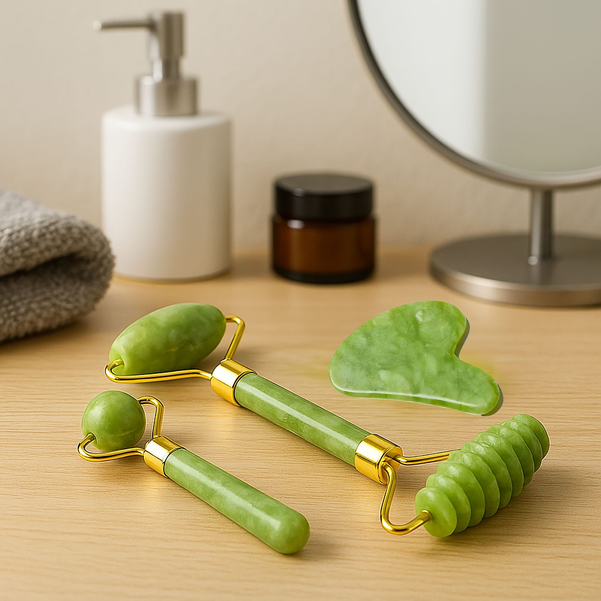 Odkryj naturalną moc jadeitu i zadbaj o swoją skórę w domowym zaciszu! Nasz 3-częściowy zestaw do masażu twarzy Gua Sha to doskonałe narzędzia do codziennej pielęgnacji twarzy, szyi i dekoltu. Wszystko wykonane jest z naturalnego jadeitu.
