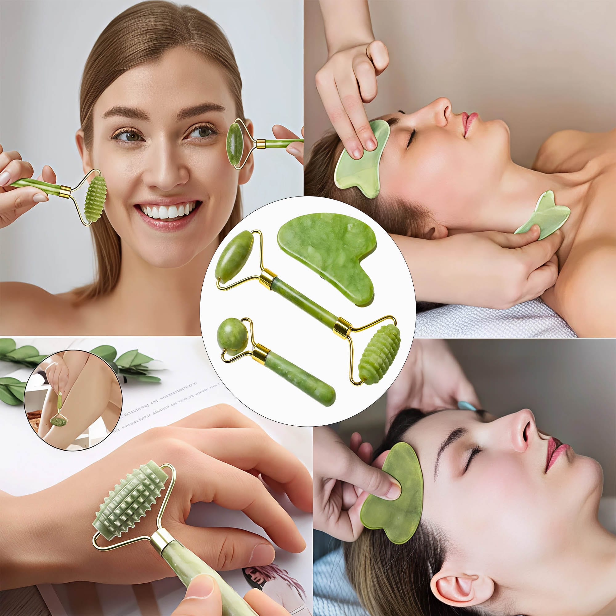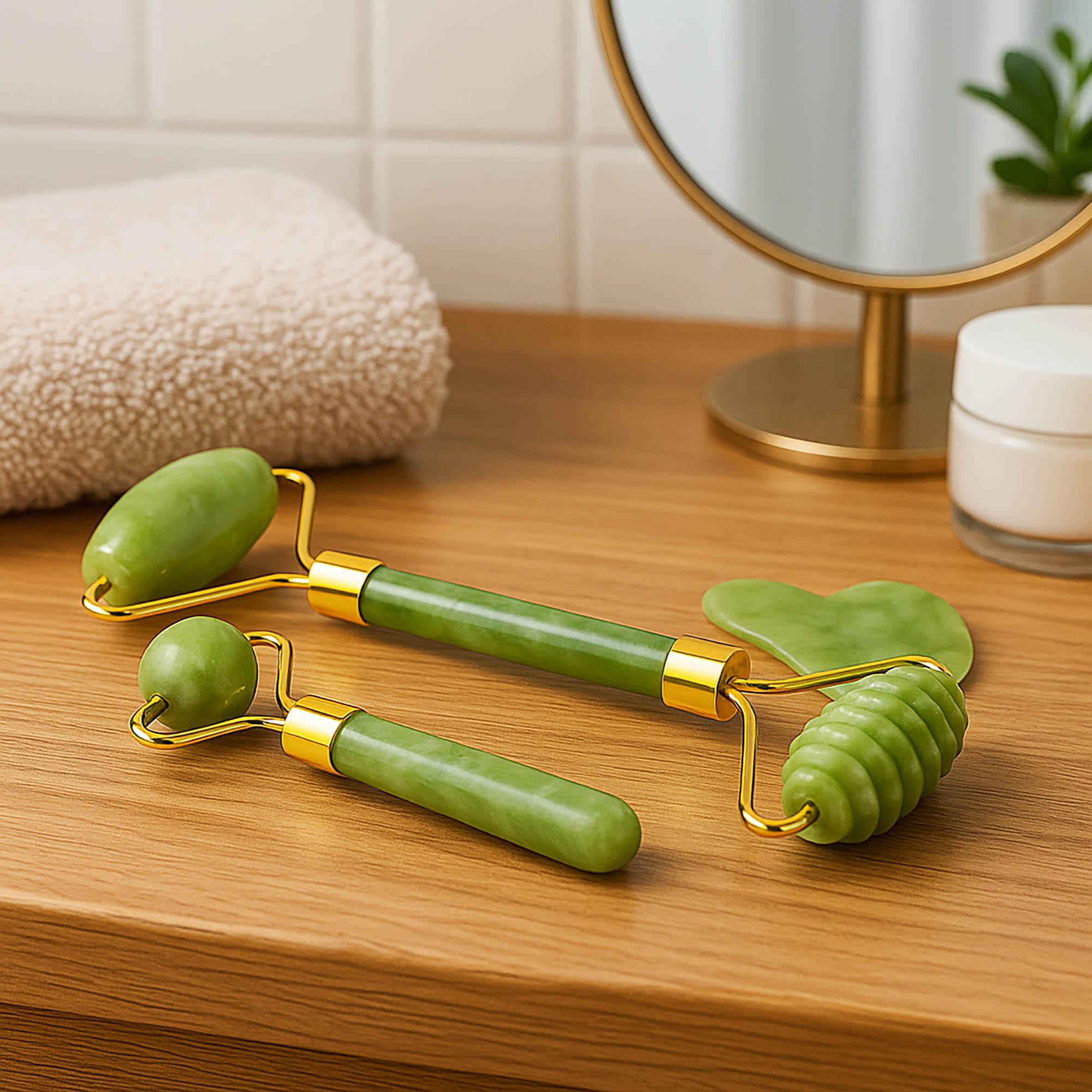 Jadeitowy roller do masażu twarzy + płytka gua sha 3w1
