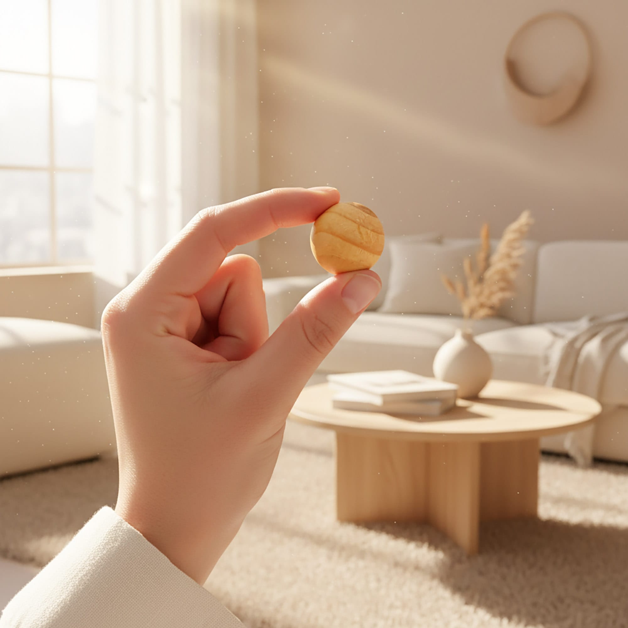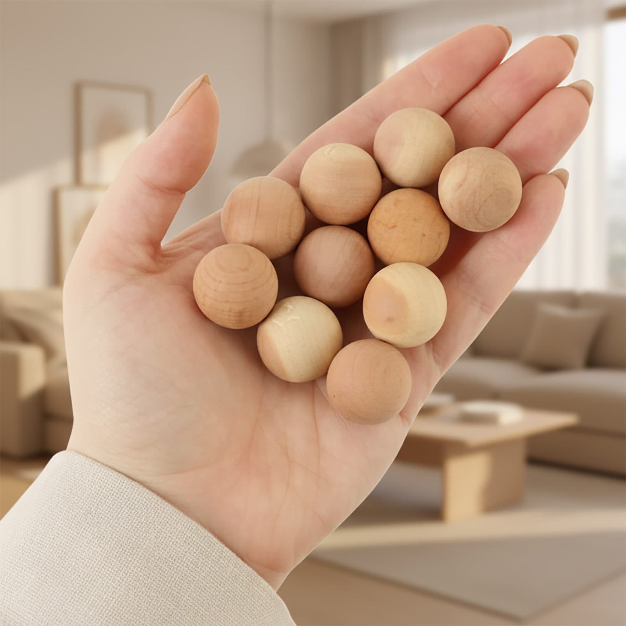 - Estetyka i ekologia: Produkt wykonany jest w 100% z surowego drewna, bez lakierów i sztucznych barwników. Jasna, naturalna struktura słojów drewna sprawia, że kulki prezentują się elegancko w każdym wnętrzu – od nowoczesnych szaf po rustykalne komody.