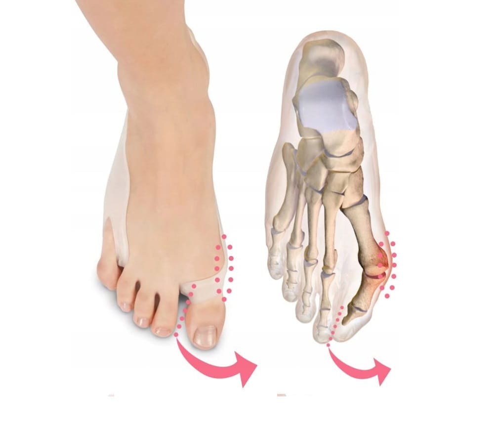 Ochrania schodzące się palce przed otarciem i uciskiem, zmniejszając przy tym bóle spowodowane haluksem oraz nienachodzącym małym palcem.