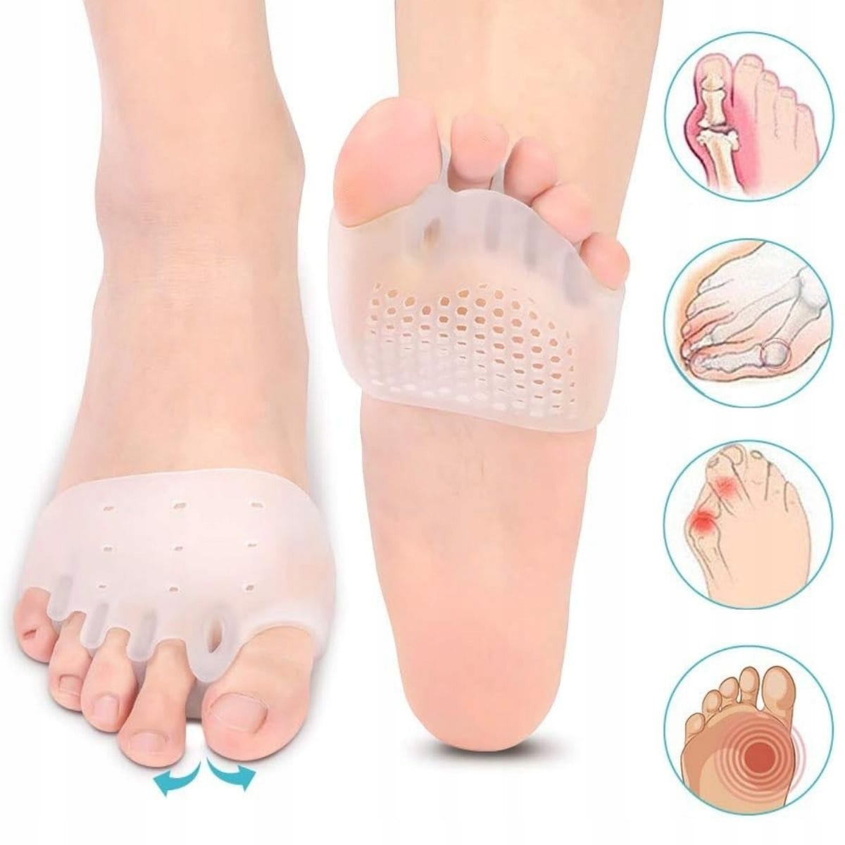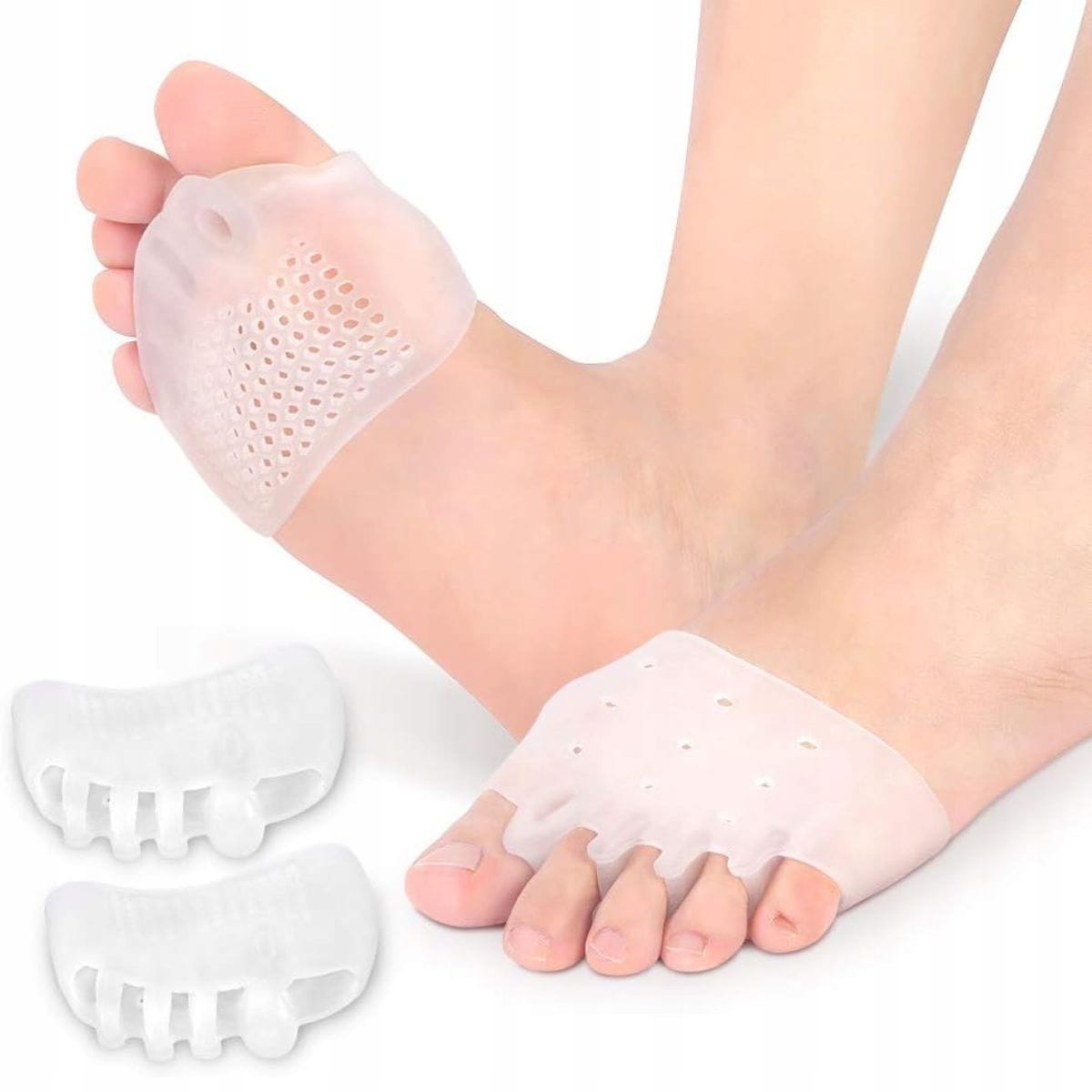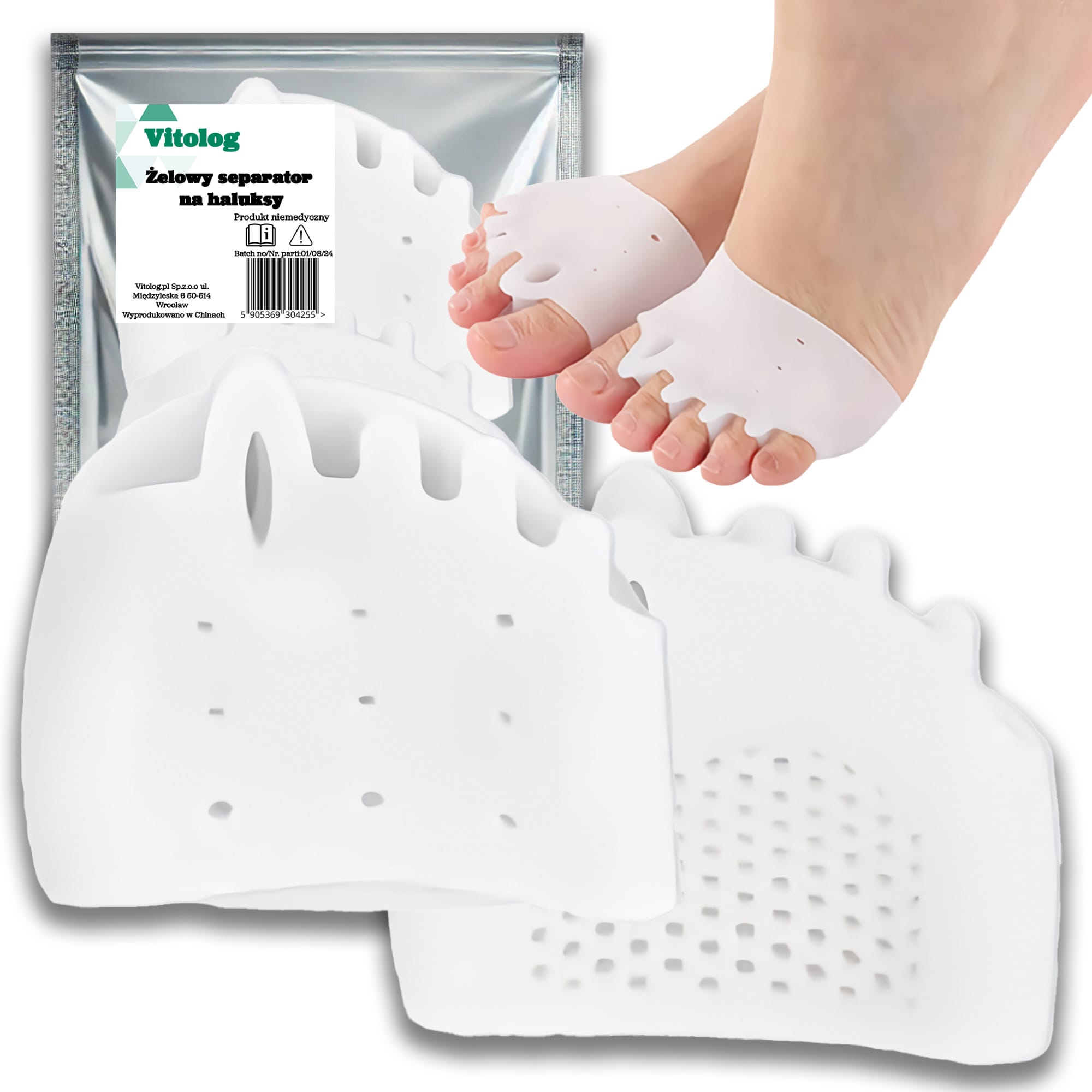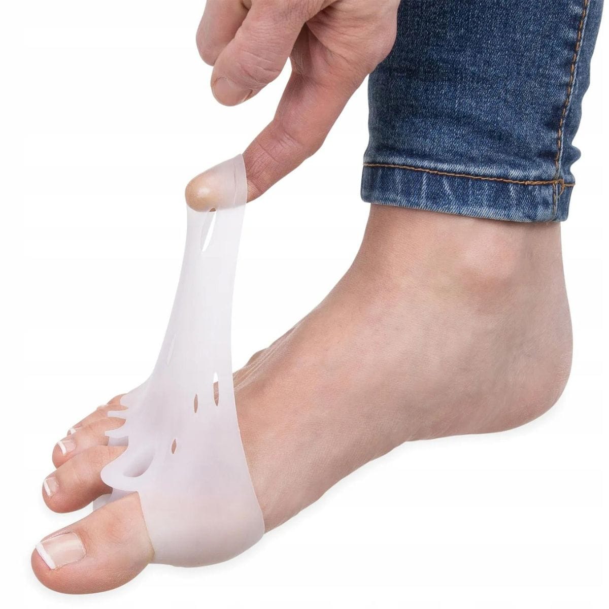 Separator palców to silikonowa opaska, która zakłada się na stopę. Opaska posiada wyprofilowane kliny, które rozdzielają palce stopy i ustawiają je w prawidłowej pozycji. Dzięki temu haluks zostaje wygięty w odpowiednim kierunku i zmniejsza się ból oraz dyskomfort.