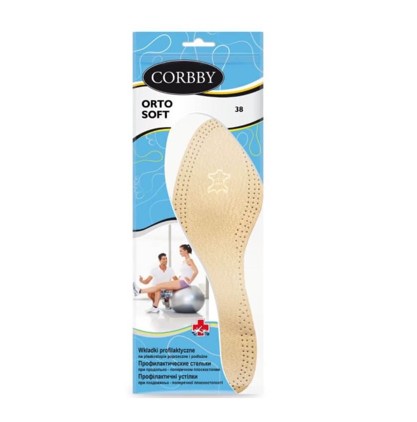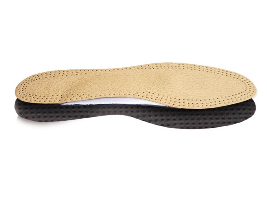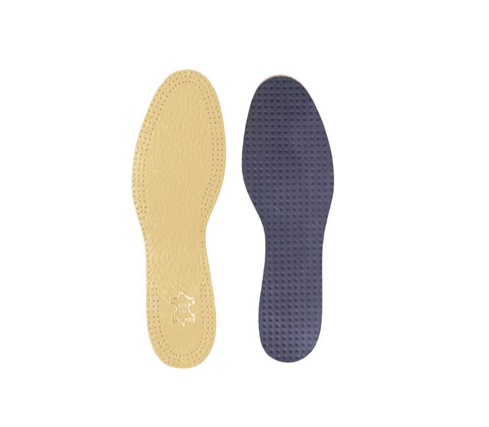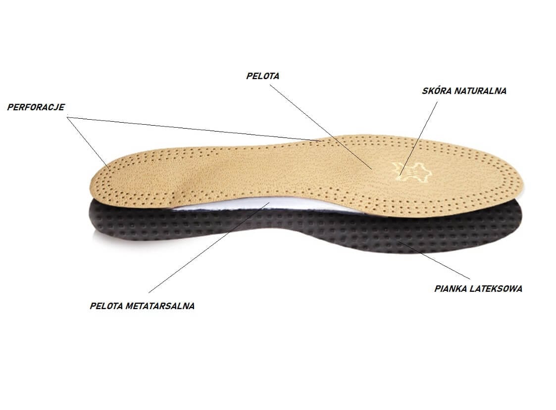 Dwuwarstwowe wkładki wykonane ze skóry naturalnej oraz pianki lateksowej. Dzięki zastosowaniu peloty metatarsalnej, wkładki do butów podpierają sklepienie podłużne i poprzeczne stopy oraz zmniejszają rozkład nacisków w przedniej części stopy.