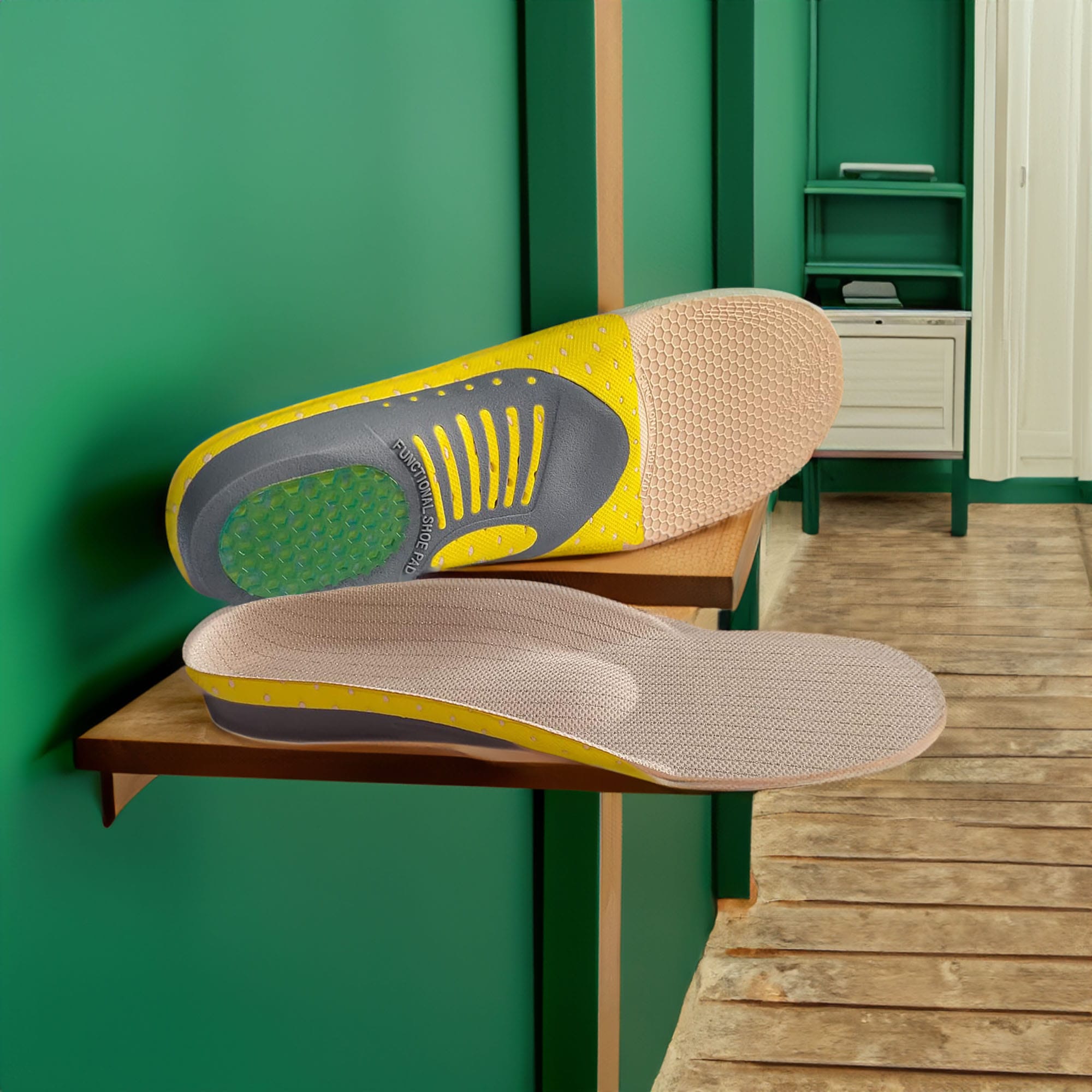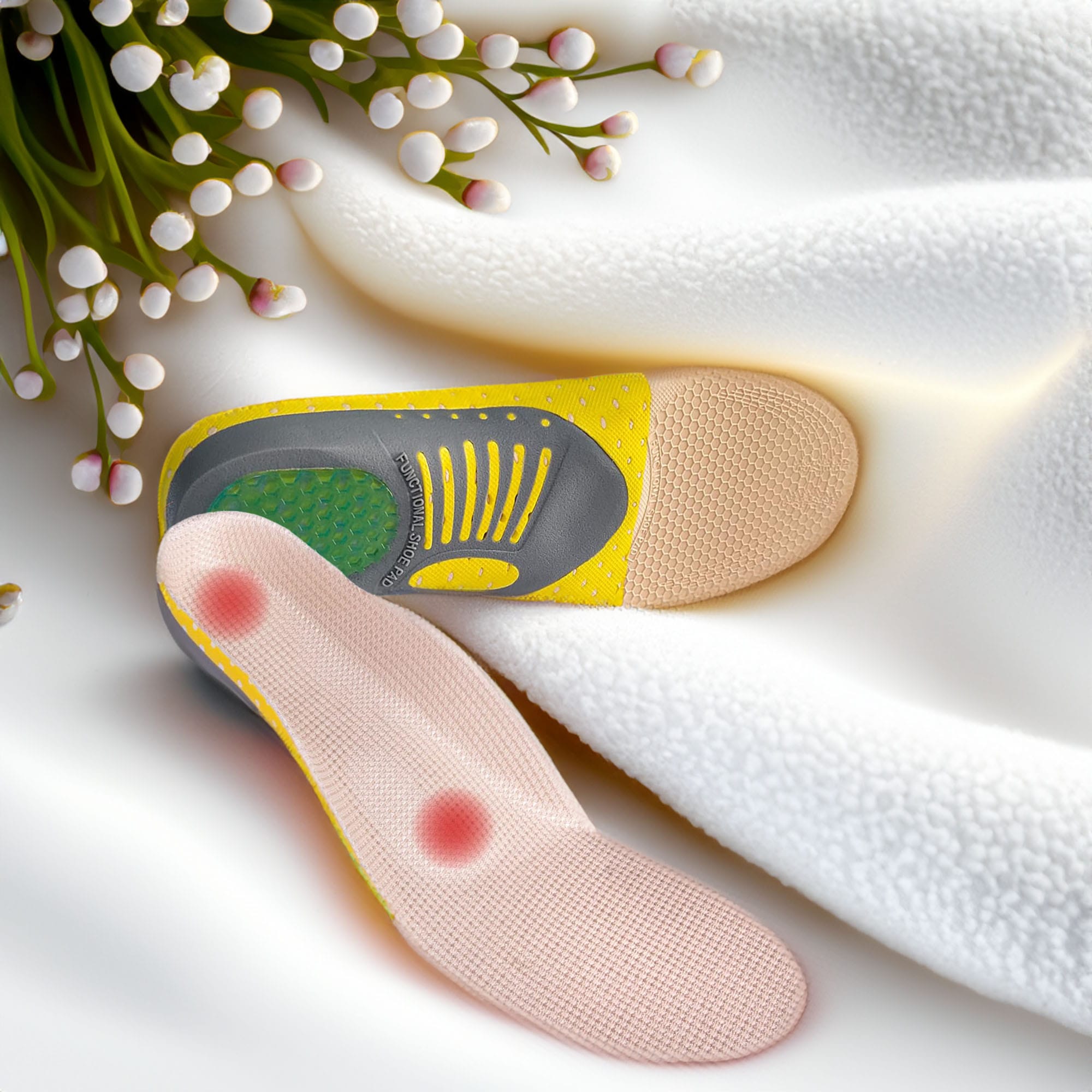 - Wysoka Jakość Materiałów: Wykonane z trwałej, ale elastycznej pianki EVA, oddychającej tkaniny siateczkowej i żelu, co gwarantuje długotrwałe użytkowanie i odpowiednią wentylację stopy.