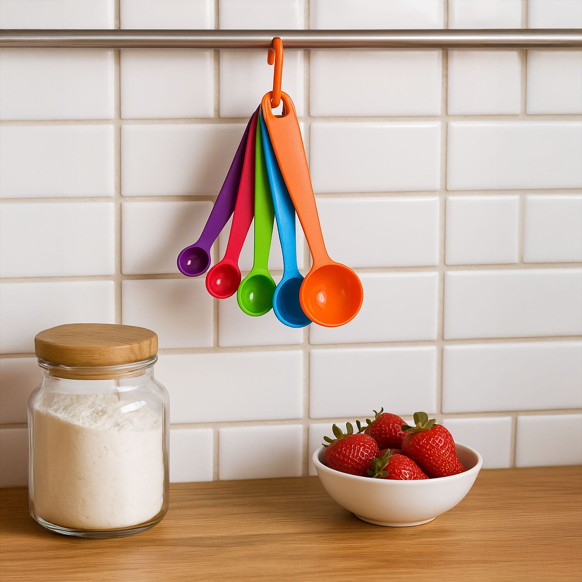 Kompletny zestaw sześciu wielokolorowych miarek plastikowych o pojemnościach od 0,6 ml do 15 ml, przeznaczony do precyzyjnego dozowania składników sypkich i płynnych. Dzięki konstrukcji pozwalającej na przechowywanie jedna w drugiej, produkt optymalizuje przestrzeń w kuchni i ułatwia dokładne przygotowywanie potraw.