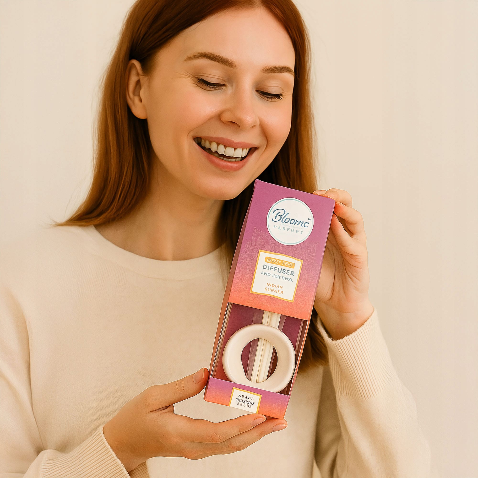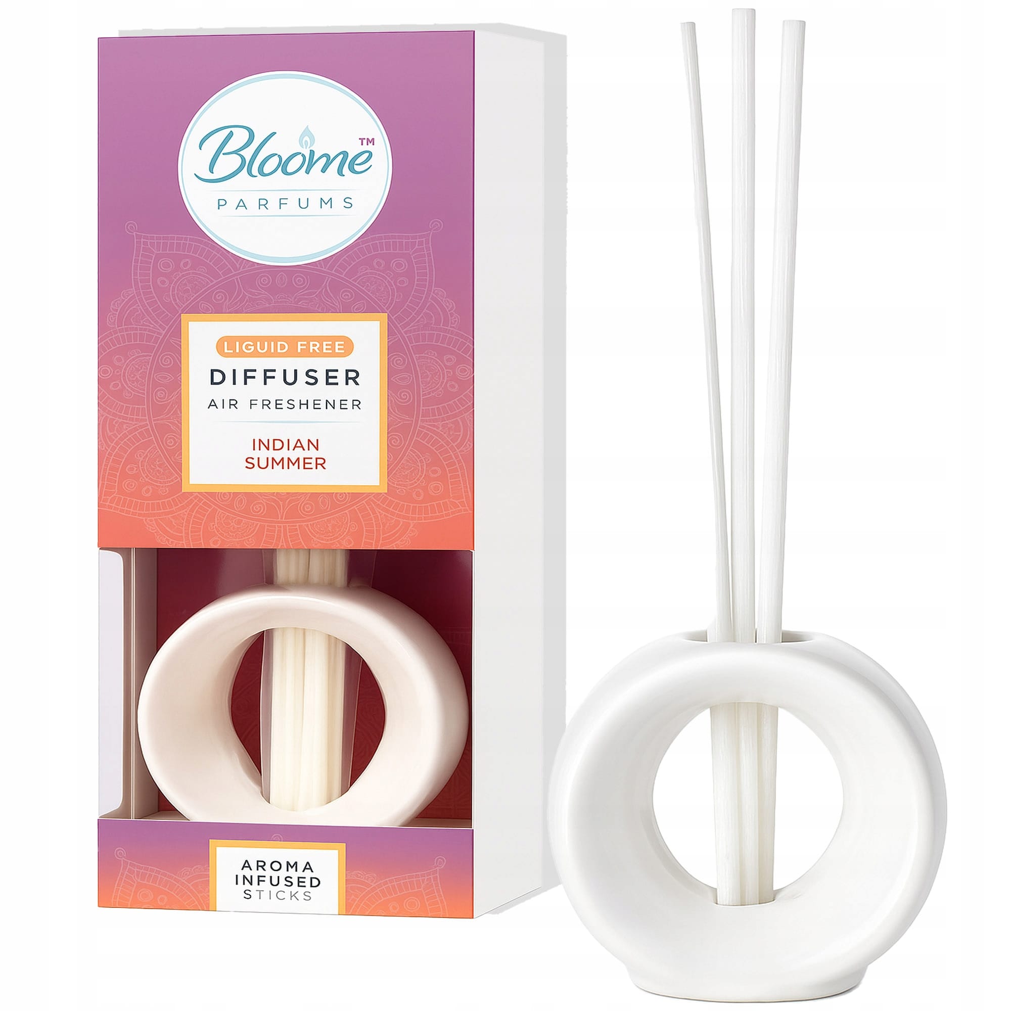 Bloome Indian Summer to zaawansowany dyfuzor zapachowy wykorzystujący mechanizm pasywnej ewaporacji do aromatyzacji pomieszczeń. Zestaw składa się z estetycznego, ceramicznego zasobnika oraz czterech patyczków nasączonych kompozycją olejków eterycznych, które uwalniają zapach drogą dyfuzji powietrznej. Produkt dedykowany jest do zastosowania w przestrzeniach mieszkalnych, biurowych oraz strefach wellness (SPA, gabinety kosmetyczne), gdzie wymagane jest utrzymanie stałego, subtelnego tła zapachowego. Jest to idealne rozwiązanie dla użytkowników poszukujących bezobsługowych systemów odświeżania powietrza, które łączą funkcjonalność z minimalistycznym designem, pasującym do wnętrz w stylu skandynawskim, nowoczesnym czy boho.